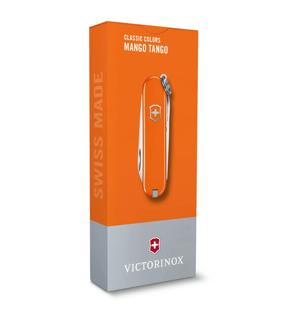 Victorinox CLASSIC SD Colors (Mango Tango - помаранчевий) - маленький і легкий складаний ніж 58 мм з 7 функціями з яскравої колекції Colors 2021 року. Лінійка Classic SD представлена моделями у форматі невеликого брелока. Популярні однотонні дизайни швейцарського кишенькового ножа з набором корисних щодня функцій. Колекція: Classic SD Colors Номер моделі 0.6223.83G Помаранчеві глянцеві накладки з органічного пластика (целідор) Всі інструменти і внутрішня частина конструкції з високоякісної неіржавної сталі Довжина - 58 мм Товщина - 9 мм Вага - 21 г 7 функцій. Постачається у подарунковій коробці, створеній спеціально для колекції Colors. Бренд: Victorinox (Вікторінокс) Країна виробництва: Швейцарія 30 приголомшливих кольорів для Classic SD Colors, виконані як з пластиковими накладками, так і культовими рифленими накладками з анодованого алюмінію. Ножі поєднують 7 зручних функцій в стильних накладках, що робить їх функціональними і привабливими. 1. маленький клинок 2. ножиці 3. пилочка для нігтів 4. - викрутка плоска 2.5 мм 5. зубочистка 6. пінцет 7. кільце для підвішування до брелока або ключів На ніж Victorinox Classic SD Colors 0.6223.83G, як і на будь-який складаний ніж Вікторінокс, поширюється довічна гарантія на якість матеріалів і заводське виробництво. Швидка доставка - Оригінальні ножі Victorinox - широка географія доставки по всій Україні.