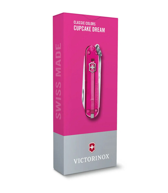 Victorinox CLASSIC SD Colors (Cupcake Dream - яскраво-рожевий) - маленький і легкий складаний ніж 58 мм з 7 функціями і стильними накладками з кольорового напівпрозорого пластика. Модель з яскравої колекції Colors 2021 року. Лінійка Classic SD представлена моделями у форматі невеликого брелока. Популярні однотонні дизайни швейцарського кишенькового ножа з набором корисних щодня функцій. Колекція: Classic SD Colors Номер моделі 0.6223.T5G Рожеві напівпрозорі накладки з ударостійкого пластика Всі інструменти і внутрішня частина конструкції з високоякісної неіржавної сталі Довжина - 58 мм Товщина - 9 мм Вага - 21 г 7 функцій. Постачається у подарунковій коробці, створеній спеціально для колекції Colors. Бренд: Victorinox (Вікторінокс) Країна виробництва: Швейцарія 30 приголомшливих кольорів для Classic SD Colors, виконані як з пластиковими накладками, так і культовими рифленими накладками з анодованого алюмінію. Ножі поєднують 7 зручних функцій в стильних накладках, що робить їх функціональними і привабливими. 1. маленький клинок 2. ножиці 3. пилочка для нігтів 4. - викрутка плоска 2.5 мм 5. зубочистка 6. пінцет 7. кільце для підвішування до брелока або ключів На ніж Victorinox Classic SD Colors 0.6223.T5G, як і на будь-який складаний ніж Вікторінокс, поширюється довічна гарантія на якість матеріалів і заводське виробництво. Швидка доставка - Оригінальні ножі Victorinox - широка географія доставки по всій Україні.