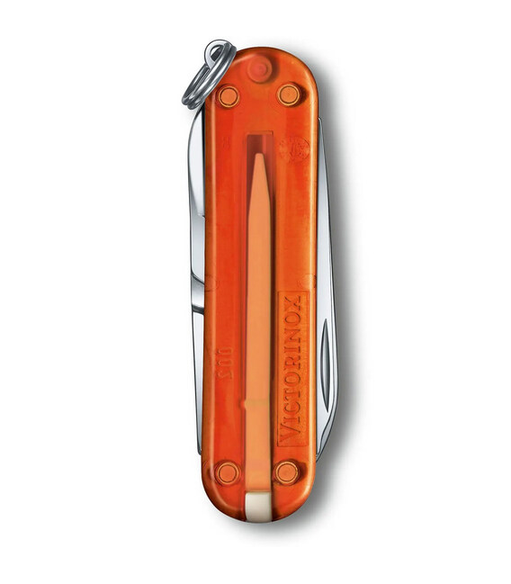 Маленький кишеньковий ніж-брелок CLASSIC SD Colors Fire Opal 58мм / 2 шари / 7 функцій / помаранчеві напівпрозорі накладки / ножиці Victorinox 0.6223.T82G