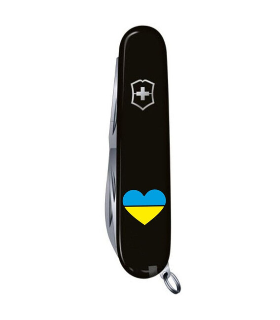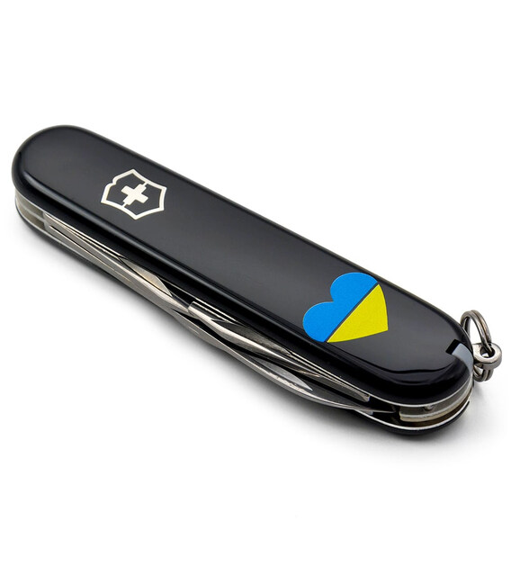 Складаний швейцарський ніж Victorinox SPARTAN UKRAINE 91мм / 12 функцій / чорні накладки / штопор / Серце синьо-жовте
