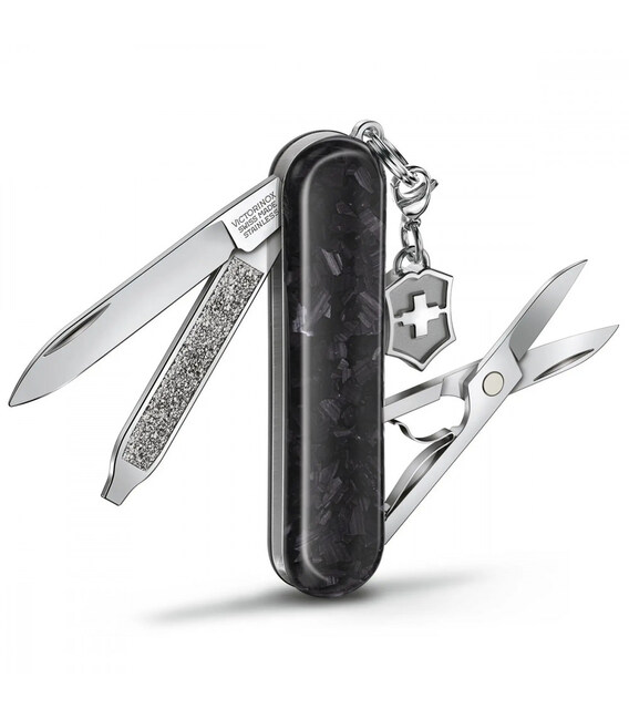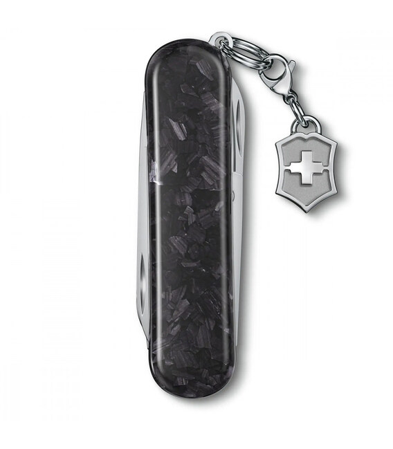 Victorinox CLASSIC SD Brilliant Carbon - складаний ніж-брелок завдовжки 58 мм на 5 функцій. Справжній витвір мистецтва з надміцними накладками з карбону.Компактний силует та високотехнологічна естетика, втілення надійності. Цей ніж стане справжнім діамантом у вашій колекції швейцарських складаних ножів. Маленький та мультизадачний, він чудовий додаток до вашого щоденного арсеналу корисних речей. А досконалий дизайн та шарм роблять цей інструмент неперевершеним за елегантністю.Інформація про ніж CLASSIC SD Brilliant Carbon:✔ Чорні накладки з карбону.✔ Ніж швейцарського виробництва з першокласної неіржавної сталі.✔ 5 функцій.✔ Розмір ножа по руків’ю (довжина х ширина х товщина), мм: 58 х 18 х 6✔ Вага: 20 г✔ Серійний номер моделі: 0.6221.90✔ Спеціальна подарункова коробка з сертифікатом якості.✔ Офіційна довічна гарантія.Функції:1. невеликий ніж 40 мм2. ножиці з пружинним механізмом3. пилочка для нігтів4. - маленька плоска викрутка 2.5 мм5. сталеве кільце зі знімним брелоком-логотипом Виготовлено у Швейцарії.Справжня продукція, професійний гарантійний сервіс та швидка доставка.