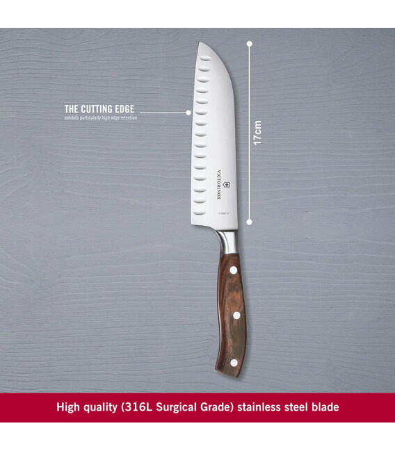 Кований ніж-сантоку Grand Maitre Wood Santoku з рифленим лезом 17см та дерев'яною ручкою (подарункова коробка) Victorinox 7.7320.17G (Швейцарія) Гарантія: довічна