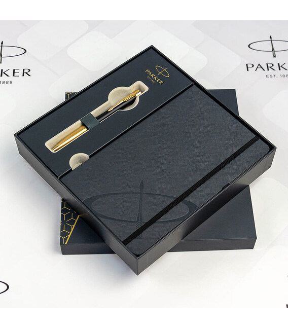 Набір із кульковою ручкою Parker URBAN Muted Black GT та блокнотом у подарунковій коробці. Ручка в чорному матовому дизайні з оздобленням позолотою з колекції Urban Twist із сучасним поворотним механізмом. Ергономічний кулеподібний силует дозволить вам насолоджуватися ідеально збалансованим письмом. Гравірування назви бренду Parker та фірмовий затискач-стріла голосно заявляють про шляхетне походження інструменту. Чудовий подарунок для шанувальників незмінної якості ручок Parker.✔ Кулькова ручка URBAN Twist Muted Black GT Латунний корпус із чорним матовим покриттям.Полірована грип-секція золотого кольору.Деталізація: PVD позолота.Поворотний механізм (повертається торець ручки).У комплектації - один кульковий стрижень QuinkFlow.Довжина ручки близько 136 мм.Товщина - 15 мм.Кульковий стрижень QuinkFlow гарантує плавний потік чорнила та рівномірно насичену лінію. Ручка пише м'яко, а чорнило не розмазується. Запас чорнила розрахований на лінію приблизно 3,5 км.✔ Блокнот Parker Розміри: 134 х 210 мм.Закривається на резинку.Тверда палітурка: сіра з логотипом Parker.Розмітка в лінійку без полів.Титульний аркуш із місцем для підпису.Набір у подарунковій коробці Parker із золотим тисненням.Розміри коробки: 225 х 225 х 43 мм.