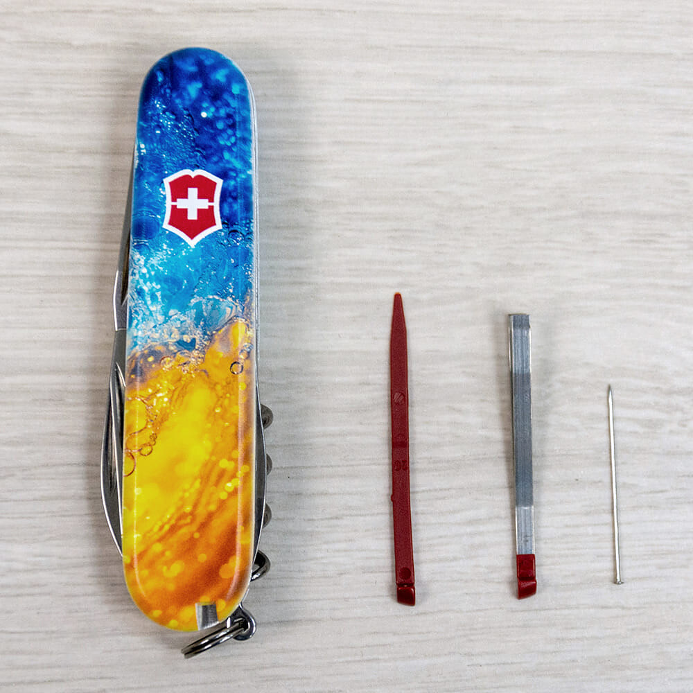 Складаний ніж SPARTAN UKRAINE [Жовто-сині бризки] з якісним кольоровим друком на обох накладках, покритих матовим лаком. Професійне виконання дизайну в українській стилістиці. Естетика на висоті завдяки матовому покриттю, яке також захистить накладки від випадкових подряпин та відбитків пальців. Спеціальна пропозиція для українських шанувальників та колекціонерів бренду Victorinox.І без того багатофункціональний SPARTAN (12 функцій), у цьому дизайні отримав у комплектацію ще й шпильку. Базовий для середніх складаних ножів інструментарій з компактним дворядним розташуванням інструментів, який завжди знайде призначення у побуті та дозвіллі; у місті та на природі. Ідеальний варіант корисного та знакового подарунка у красивій упаковці з прозорим віконцем, що дозволяє бачити дизайн одразу та підкреслює ексклюзивність подарунка.Інформація про складаний ніж Victorinox 1.3603.7.T3160pw✔ Спецвипуск VICTORINOX UKRAINE (початок випуску 2024, доступний тільки в Україні).✔ Ексклюзивний дизайн [Жовто-сині бризки] у комплектації ножа SPARTAN.✔ Тип нанесення малюнка: повне цифрове повноколірне задруковування на пластикових накладках.✔ Накладки покрито матовим лаком (MAT) для захисту та естетичного вигляду.✔ Друк та покриття лаком на високоякісному професійному обладнанні в Україні.✔ Заміна пінцета та зубочистки на червоні для гармонійного поєднання з дизайном.✔ До комплектації додано шпильку.✔ Кількість функцій: 12+1.✔ Середній розмір складаного ножа: довжина 91 мм – ширина 26 мм – товщина 14 мм✔ Вага ножа: 59 г✔ Презентабельна подарункова коробка Victorinox із прозорим віконцем (всередині – оригінальний сертифікат-гарантія).✔ Ніж виготовлено у Швейцарії.✔ Victorinox AG гарантує, що всі ножі із першокласної неіржавної сталі.1. лезо завдовжки 6 см2. лезо завдовжки 3,5 см3-5. відкривачка для пляшок з плоскою викруткою 6 мм на кінці та пазом для ізоляції6-7. консервний ніж із плоскою викруткою 3 мм на кінці8. штопор9. шило з функцією кернера або дірокола10. пінцет у передній накладці11. зубочистка у задній накладці12. сталеве кільце13. шпилька (у слоті біля штопора)