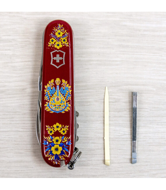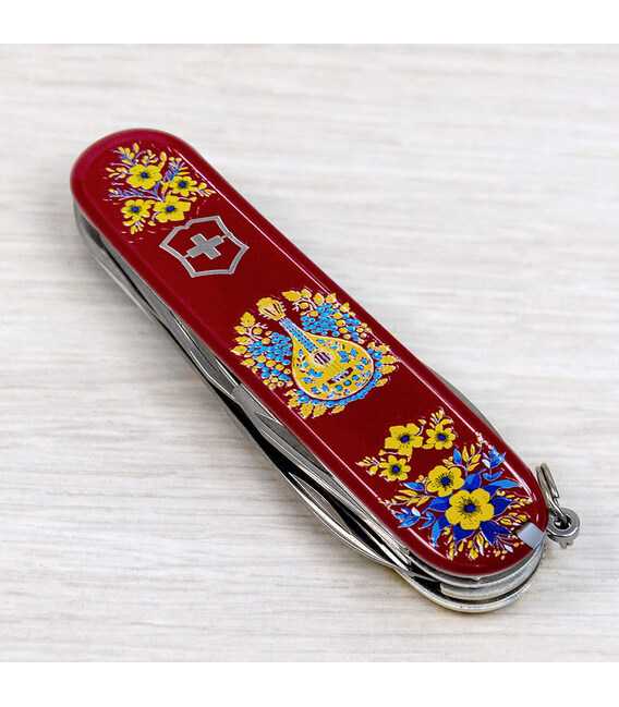 Швейцарський складаний ніж 91 мм на 13 функцій - CAMPER UKRAINE [Українські мотиви; червоні накладки]. Спеціальна пропозиція для українських шанувальників та колекціонерів бренду Victorinox. Ексклюзивний дизайн, центральним елементом якого виступив український народний інструмент - кобза.Ідеальний похідний ніж із супер гострою пилкою по дереву для туристів та всіх, хто любить проводити час на свіжому повітрі. Корисний для середніх складаних ножів інструментарій із компактним трирядним розташуванням інструментів.Складаний ніж Victorinox 1.3613.T1370u✔ Спецвипуск VICTORINOX UKRAINE (початок випуску 2024 рік, доступний тільки в Україні).✔ Ексклюзивний дизайн [Українські мотиви] у комплектації ножа CAMPER.✔ Червоні глянцеві накладки з удароміцного пластику (целідор).✔ Тип нанесення малюнка: стійкий до стирання УФ друк на лицьовій накладці.✔ Кількість функцій: 13.✔ Середній розмір складаного ножа: довжина 91 мм – ширина 26 мм – товщина 18 мм✔ Ніж виготовлено у Швейцарії.✔ Патріотичний дизайн виконано на високоякісному професійному обладнанні в Україні.✔ Victorinox AG гарантує, що всі ножі з першокласної неіржавної сталі. ✔ Оригінальна картонна коробочка Victorinox з сертифікатом-гарантією.1. лезо 6 см2. лезо 3,5 см3-5. відкривачка для пляшок з плоскою викруткою 6 мм на кінці та пазом для ізоляції6-7. консервний ніж з плоскою викруткою 3 мм на кінці8. пилка по дереву9. шило з функцією кернера або дірокола10. пінцет у передній накладці11. зубочистка в задній накладці12. штопор13. сталеве кільце