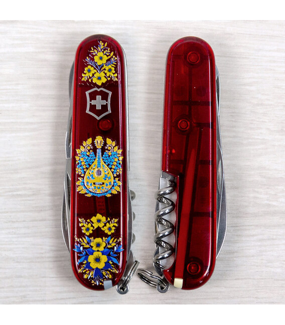 Швейцарський складаний ніж 91 мм на 14 функцій - CLIMBER UKRAINE [Українські мотиви; червоні транспарентні накладки]. Спеціальна пропозиція для українських шанувальників та колекціонерів бренду Victorinox. Ексклюзивний дизайн, центральним елементом якого виступив український народний інструмент - кобза.Багатофункціональний ніж, який стане в нагоді у туристичному поході, відрядженні, щодня у вашій сумці, рюкзаку, кишені. Вдалий для середніх складаних ножів інструментарій зі зручним трирядним розташуванням інструментів, серед яких вам точно сподобаються повноцінні ножиці.Складаний ніж Victorinox 1.3703.T.T1370u✔ Спецвипуск VICTORINOX UKRAINE (початок випуску 2024 рік, доступний тільки в Україні).✔ Ексклюзивний дизайн [Українські мотиви] у комплектації ножа CLIMBER.✔ Червоні напівпрозорі накладки з ABS-пластика.✔ Тип нанесення малюнка: стійкий до стирання УФ друк на лицьовій накладці.✔ Кількість функцій: 14.✔ Середній розмір складаного ножа: довжина 91 мм – ширина 26 мм – товщина 18 мм✔ Ніж виготовлено у Швейцарії.✔ Патріотичний дизайн виконано на високоякісному професійному обладнанні в Україні.✔ Victorinox AG гарантує, що всі ножі з першокласної неіржавної сталі. ✔ Оригінальна картонна коробочка Victorinox з сертифікатом-гарантією.1. лезо 6 см2. лезо 3,5 см3-5. відкривачка для пляшок з плоскою викруткою 6 мм на кінці та пазом для ізоляції6-7. консервний ніж із плоскою викруткою 3 мм на кінці8. ножиці з пружинним механізмом9. гачок10. шило з функцією кернера або дірокола11. пінцет у передній накладці12. зубочистка у задній накладці13. штопор14. сталеве кільце