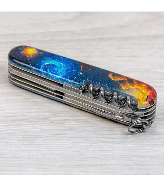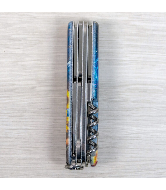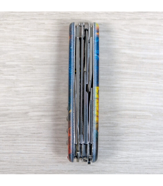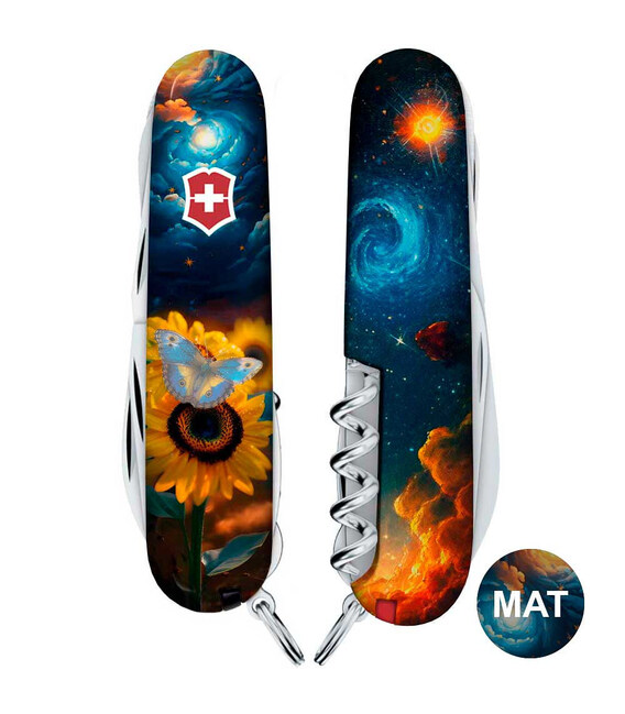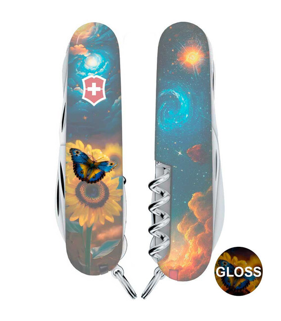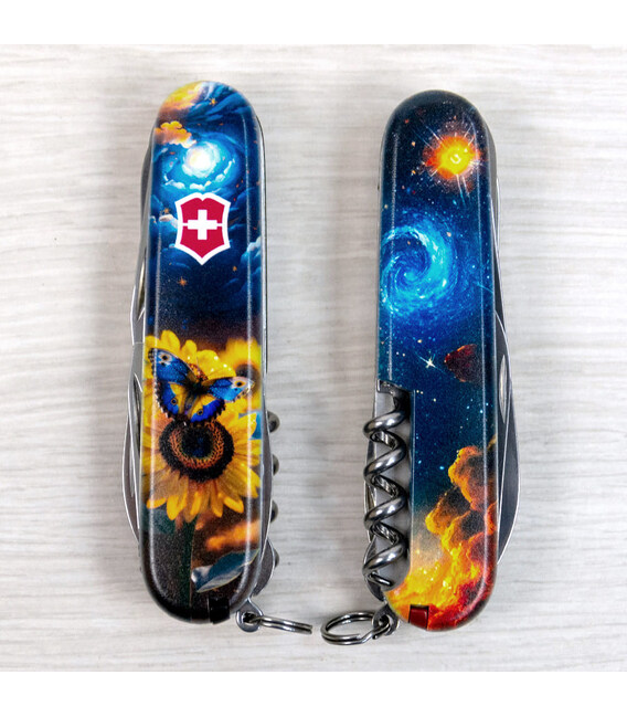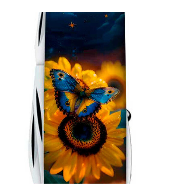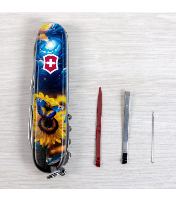 Багатофункціональний ніж HUNTSMAN UKRAINE [Зоряний метелик] з якісним кольоровим друком на обох накладках та комбінованим матово-глянцевим лаковим покриттям. Професійне виконання ексклюзивного дизайну. Спеціальна естетична пропозиція для українських шанувальників та колекціонерів бренду Victorinox.Серія Huntsman поєднує кишенькові ножі середнього розміру та пропонує великий набір інструментів для різної активності на свіжому повітрі, а ця ексклюзивна модель отримала додатково в комплектацію ще й шпильку. Стане незамінним помічником вдома, на дачі, в поході: перепиляти невелику колоду або дошку, відрізати, відкрити банку або пляшку, відкрутити або закрутити, упорядкувати нігті, обрізати зайві нитки на одязі – Victorinox Huntsman готовий до всього. Незамінний набір інструментів, щоб підготуватися до щоденних викликів. А гарна коробочка з прозорим віконцем дозволяє бачити дизайн одразу та підкреслює ексклюзивність подарунка.Складаний ніж Victorinox 1.3713.3.T3240pw✔ Спецвипуск VICTORINOX UKRAINE (початок випуску 2024 рік, доступний лише в Україні).✔ Ексклюзивний дизайн [Зоряний метелик] у комплектації ножа HUNTSMAN.✔ Тип нанесення малюнка: повне цифрове повноколірне задруковування на оригінальних пластикових накладках.✔ Матово-глянцевий дизайн (MAT/GLOSS): накладки покрито матовим лаком, метелик - глянцевий.✔ Друк та покриття лаком на високоякісному професійному обладнанні в Україні.✔ Заміна пінцета на чорний та зубочистки на червону для гармонійного поєднання з дизайном.✔ До комплектації додано шпильку.✔ Кількість функцій: 15+1.✔ Середній розмір складаного ножа: довжина 91 мм – ширина 26 мм – товщина 21 мм✔ Презентабельна подарункова коробка Victorinox із прозорим віконцем (всередині – оригінальний сертифікат-гарантія).✔ Ніж виготовлено у Швейцарії.✔ Victorinox AG гарантує, що всі ножі із першокласної неіржавної сталі.1. лезо завдовжки 6 см2. лезо завдовжки 3,5 см3-5. відкривачка для пляшок з плоскою викруткою 6 мм на кінці та пазом для ізоляції6-7. консервний ніж із плоскою викруткою 3 мм на кінці8. пилка по дереву9. ножиці з пружинним механізмом10. шило з функцією кернера або дірокола11. пінцет у передній накладці12. зубочистка у задній накладці13. сталеве кільце14. гачок15. штопор16. шпилька (у слоті біля штопора)