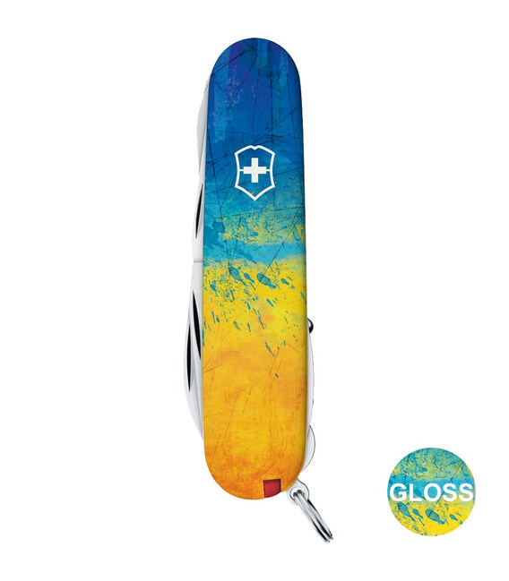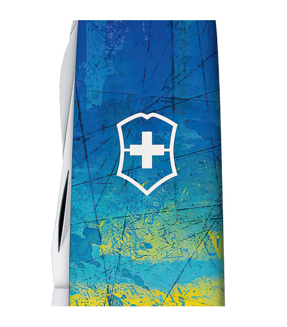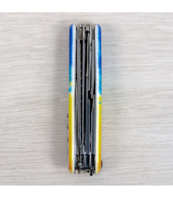 Ексклюзивний багатофункціональний ніж HUNTSMAN UKRAINE [Жовто-синій малюнок] з якісним кольоровим друком на обох накладках, покритих глянцевим лаком. Професійне виконання дизайну з українськими смислами. Спеціальна естетична пропозиція для українських шанувальників та колекціонерів бренду Victorinox.Серія Huntsman поєднує кишенькові ножі середнього розміру та пропонує великий набір інструментів для різної активності на свіжому повітрі, а ця ексклюзивна модель отримала додатково в комплектацію ще й шпильку. Стане незамінним помічником вдома, на дачі, в поході: перепиляти невелику колоду або дошку, відрізати, відкрити банку або пляшку, відкрутити або закрутити, упорядкувати нігті, обрізати зайві нитки на одязі – Victorinox Huntsman готовий до всього. Незамінний набір інструментів, щоб підготуватися до щоденних викликів. А гарна коробочка з прозорим віконцем дозволяє бачити дизайн одразу та підкреслює ексклюзивність подарунка.Складаний ніж Victorinox 1.3713.7.T3100pw✔ Спецвипуск VICTORINOX UKRAINE (початок випуску 2024 рік, доступний лише в Україні).✔ Ексклюзивний дизайн [Жовто-синій малюнок] у комплектації ножа HUNTSMAN.✔ Тип нанесення малюнка: повне цифрове повноколірне задруковування на оригінальних пластикових накладках.✔ Накладки покрито глянцевим лаком (GLOSS) для захисту друку та блискучого зовнішнього вигляду.✔ Друк та покриття лаком на високоякісному професійному обладнанні в Україні.✔ Заміна пінцета та зубочистки на червоні для гармонійного поєднання з дизайном.✔ До комплектації додано шпильку.✔ Кількість функцій: 15+1.✔ Середній розмір складаного ножа: довжина 91 мм – ширина 26 мм – товщина 21 мм✔ Презентабельна подарункова коробка Victorinox із прозорим віконцем (всередині – оригінальний сертифікат-гарантія).✔ Ніж виготовлено у Швейцарії.✔ Victorinox AG гарантує, що всі ножі із першокласної неіржавної сталі.1. лезо завдовжки 6 см2. лезо завдовжки 3,5 см3-5. відкривачка для пляшок з плоскою викруткою 6 мм на кінці та пазом для ізоляції6-7. консервний ніж із плоскою викруткою 3 мм на кінці8. пилка по дереву9. ножиці з пружинним механізмом10. шило з функцією кернера або дірокола11. пінцет у передній накладці12. зубочистка у задній накладці13. сталеве кільце14. гачок15. штопор16. шпилька (у слоті біля штопора)