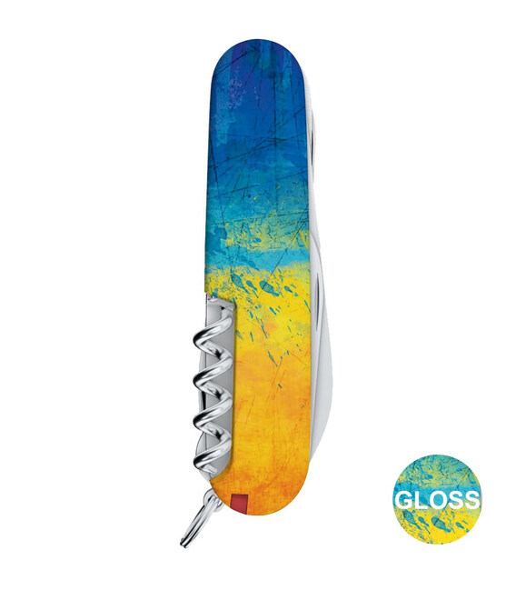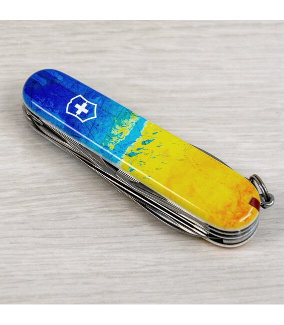 Ексклюзивний складаний ніж Victorinox HUNTSMAN UKRAINE 91мм/16 функцій/штопор/ножиці/пилка/гачок /Жовто-синій малюнок (Швейцарія) Гарантія: довічна