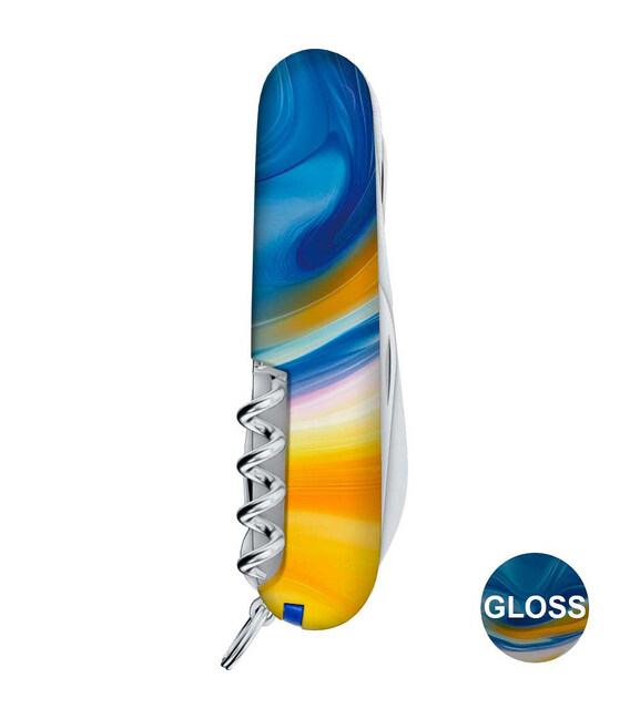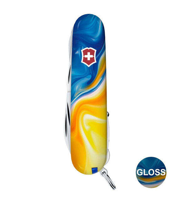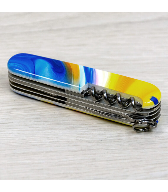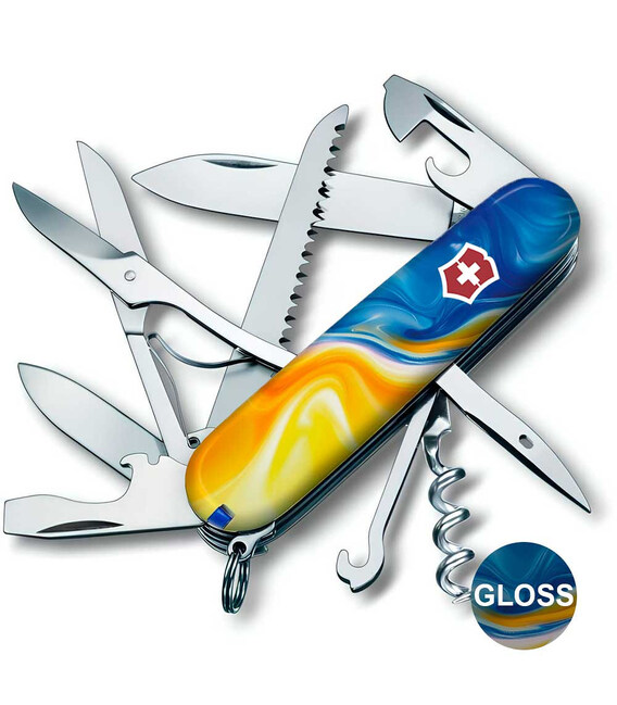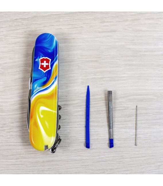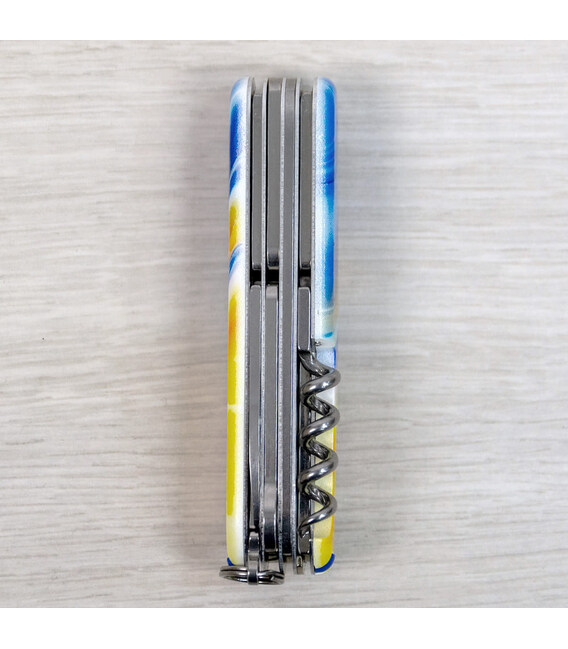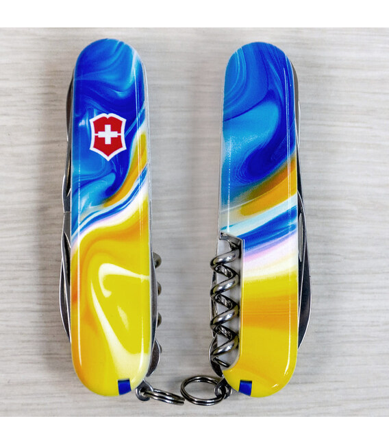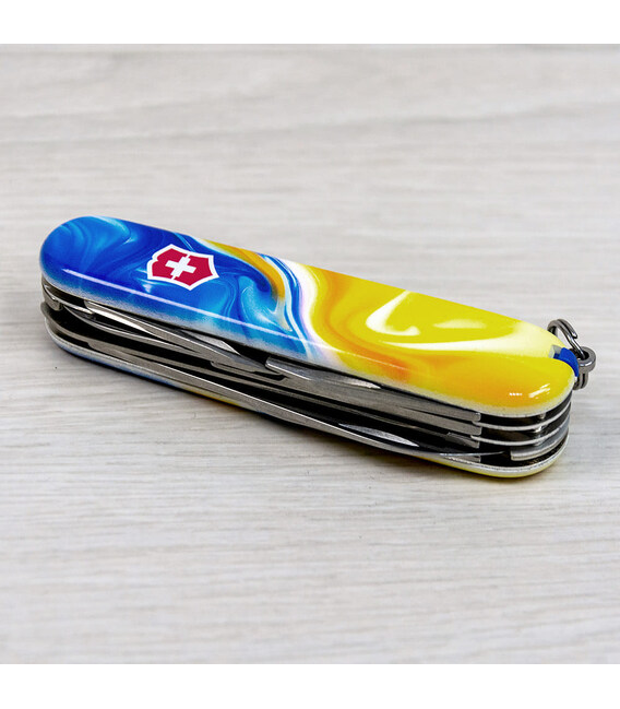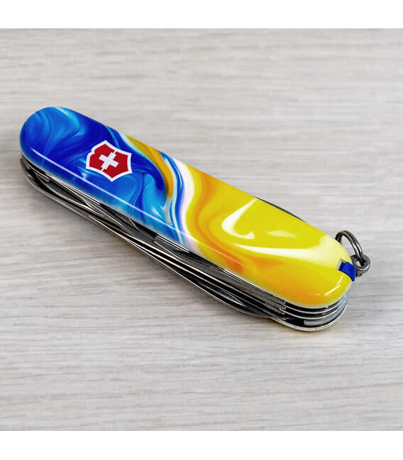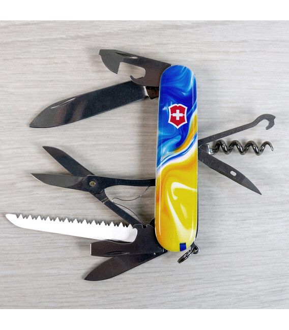 Ексклюзивний ніж HUNTSMAN UKRAINE [Жовто-сині фарби] з абстрактним кольоровим друком на обох накладках, покритих глянцевим лаком. Професійне виконання дизайну з українськими смислами. Спеціальна естетична пропозиція для українських шанувальників та колекціонерів бренду Victorinox.Серія Huntsman поєднує кишенькові ножі середнього розміру та пропонує великий набір інструментів для різної активності на свіжому повітрі, а ця ексклюзивна модель отримала додатково в комплектацію ще й шпильку. Стане незамінним помічником вдома, на дачі, в поході: перепиляти невелику колоду або дошку, відрізати, відкрити банку або пляшку, відкрутити або закрутити, упорядкувати нігті, обрізати зайві нитки на одязі – Victorinox Huntsman готовий до всього. Незамінний набір інструментів, щоб підготуватися до щоденних викликів. А гарна коробочка з прозорим віконцем дозволяє бачити дизайн одразу та підкреслює ексклюзивність подарунка.Складаний ніж Victorinox 1.3713.7.T3250pw✔ Спецвипуск VICTORINOX UKRAINE (початок випуску 2024 рік, доступний лише в Україні).✔ Ексклюзивний дизайн [Жовто-сині фарби] у комплектації ножа HUNTSMAN.✔ Тип нанесення малюнка: повне цифрове повноколірне задруковування на оригінальних пластикових накладках.✔ Накладки покрито глянцевим лаком (GLOSS) для захисту друку та блискучого зовнішнього вигляду.✔ Друк та покриття лаком на високоякісному професійному обладнанні в Україні.✔ Заміна пінцета та зубочистки на сині для гармонійного поєднання з дизайном.✔ До комплектації додано шпильку.✔ Кількість функцій: 15+1.✔ Середній розмір складаного ножа: довжина 91 мм – ширина 26 мм – товщина 21 мм✔ Презентабельна подарункова коробка Victorinox із прозорим віконцем (всередині – оригінальний сертифікат-гарантія).✔ Ніж виготовлено у Швейцарії.✔ Victorinox AG гарантує, що всі ножі із першокласної неіржавної сталі.1. лезо завдовжки 6 см2. лезо завдовжки 3,5 см3-5. відкривачка для пляшок з плоскою викруткою 6 мм на кінці та пазом для ізоляції6-7. консервний ніж із плоскою викруткою 3 мм на кінці8. пилка по дереву9. ножиці з пружинним механізмом10. шило з функцією кернера або дірокола11. пінцет у передній накладці12. зубочистка у задній накладці13. сталеве кільце14. гачок15. штопор16. шпилька (у слоті біля штопора)