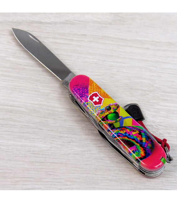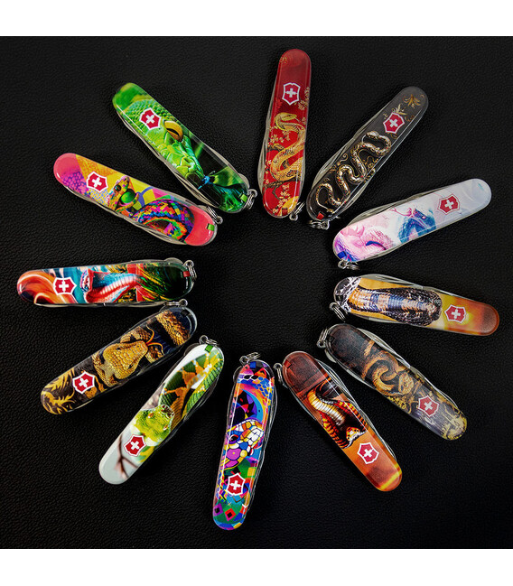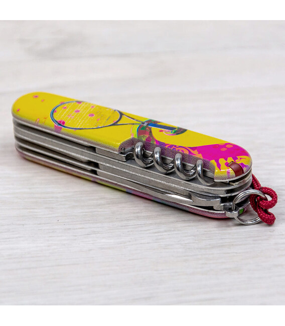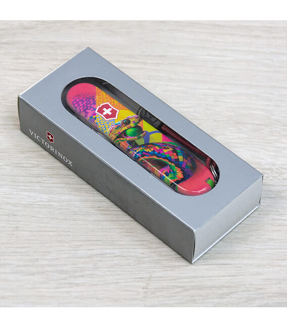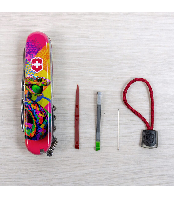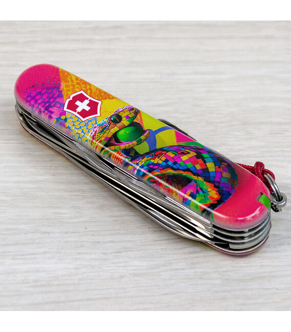 Кишеньковий ніж HUNTSMAN ZODIAC 2025 [Змія-тенісист], присвячений року Змії. 15 функцій, які зазвичай має модель Huntsman, у святковому випуску доповнені шпилькою і кольоровим темлячком. Легендарна якість швейцарських армійських ножів Victorinox у поєднанні з професійно виконаним друком на накладках. Цей екземпляр стане не лише корисним багатозадачником для адептів активного відпочинку та туризму, а й унікальним подарунком чи предметом колекціонування.Символом 2025 року буде Змія, яка є символом мудрості та спокою, уособлює гнучкість, креативність та духовний розвиток. Має природну здатність адаптуватися до змін і знаходити баланс, що важливо у всіх сферах життя.Інформація про складаний ніж Victorinox 1.3713.Z4300pk✔ Святковий спецвипуск VICTORINOX ZODIAC 2025 зі Змією.✔ Ексклюзивний дизайн [Змія-тенісист] у комплектації ножа HUNTSMAN (доступний лише в Україні).✔ Метод нанесення малюнка: повноколірний цифровий друк на оригінальних пластикових накладках.✔ Друк покритий захисним глянцевим лаком (GLOSS).✔ Персоналізація друком та покриття лаком виконані на високоякісному професійному обладнанні в Україні.✔ Заміна пінцета на зелений та зубочистки на червону для естетичного поєднання з дизайном накладок.✔ У комплектацію додані шпилька та підвіска-темляк.✔ Кількість функцій: 15+2.✔ Подарункова коробка Victorinox з прозорим віконцем + оригінальний сертифікат-гарантія.✔ Ніж швейцарського виробництва із висококласної неіржавної сталі.1. основне лезо (6 см)2. менше лезо (3,5 см)3-5. відкривачка, комбінована з викруткою 6 мм та пазом для ізоляції.6-7. консервний ніж з викруткою 3 мм8. пилка по дереву9. ножиці з пружинним механізмом10. штопор11. шило з функцією кернера або дірокола12. пінцет у передній накладці13. зубочистка у задній накладці14. сталевий гачок15. кільце для кріплення16. сталева шпилька17. червоний темляк Victorinox Оригінальні швейцарські ножі Victorinox у магазині ексклюзивних аксесуарів зі всього світу chemodanoff.com.ua.Гарантія якості та швидка доставка.