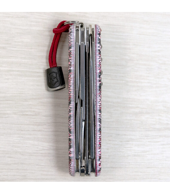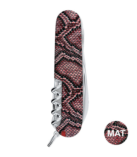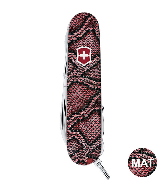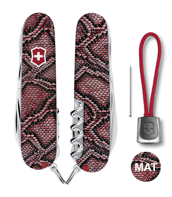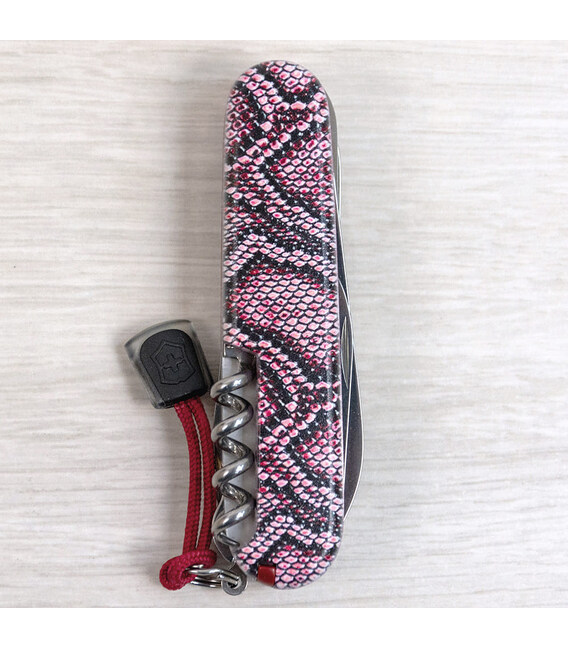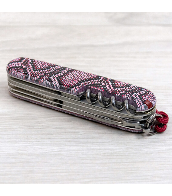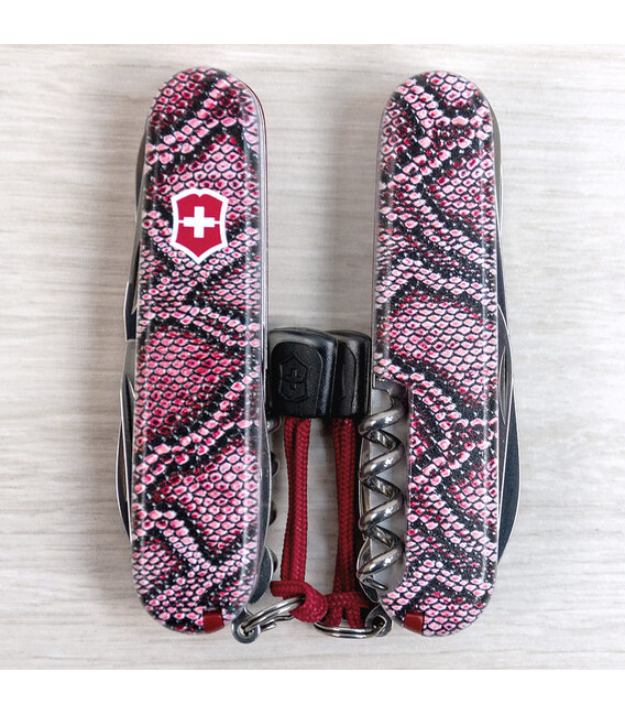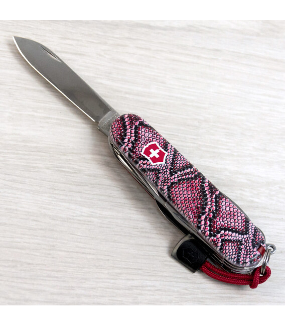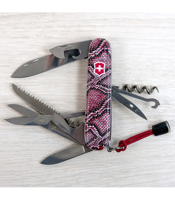 Складаний ніж HUNTSMAN DESIGN [Принт Шкіра пітона] на 15 функцій у цьому ексклюзивному випуску доповнено шпилькою та кольоровим темлячком. Легендарна якість швейцарських армійських ножів Victorinox у поєднанні з професійно виконаним друком, який покриває всю поверхню накладок. Ця модель посяде гідне місце у вашій колекції кишенькових ножів Victorinox, а також стане стильним та корисним подарунком до Нового 2025 року або людям, які народилися на рік Змії.Інформація про складаний ніж Victorinox 1.3713.R2200pk✔ Ексклюзивний випуск VICTORINOX з дизайном, доступним тільки в Україні.✔ Комплектація ножа HUNTSMAN з накладками [Принт Шкіра пітона].✔ Гарно деталізований повноколірний цифровий друк на оригінальних пластикових накладках.✔ Накладки покрито матовим захисним лаком (MAT).✔ Персоналізація друком та покриття лаком виконані на високоякісному професійному обладнанні в Україні.✔ Заміна пінцета та зубочистки на червоні для естетичного поєднання з дизайном накладок.✔ У комплектацію додані шпилька та підвіска-темляк.✔ Кількість функцій: 15+2.✔ Подарункова коробка Victorinox з прозорим віконцем + оригінальний сертифікат-гарантія.✔ Ніж швейцарського виробництва із висококласної нержавіючої сталі.1. основне лезо (6 см)2. менше лезо (3,5 см)3-5. відкривачка, комбінована з викруткою 6 мм та пазом для ізоляції.6-7. консервний ніж з викруткою 3 мм8. пилка по дереву9. ножиці з пружинним механізмом10. штопор11. шило з функцією кернера або дірокола12. пінцет у передній накладці13. зубочистка у задній накладці14. сталевий гачок15. кільце для кріплення16. сталева шпилька17. червоний темляк Victorinox Оригінальні швейцарські ножі Victorinox у магазині ексклюзивних аксесуарів зі всього світу chemodanoff.com.ua.Гарантія якості та швидка доставка.
