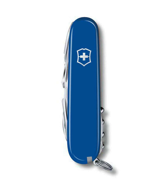Victorinox SWISS CHAMP (синій) – швейцарський багатозадачний ніж 91 мм на 33 функції. Представляє колекцію середніх ножів Victorinox і є рекордсменом за кількістю інструментів. Це технічно та естетично досконалий кишеньковий ніж із безліччю функцій та безмежними можливостями. Всі інструменти гарантують бездоганну, довговічну роботу, не люфлять. Ножовий замок Slip-joint – це перевірена часом конструкція, яка фіксує лезо в положенні до руків’я та надійно захищає від закидання під час роботи.Інформація про складаний ніж Victorinox SWISS CHAMP [1.6795.2]✔ Виготовлений із висококласної неіржавної сталі.✔ Сині накладки-руків’я з міцного пластика з логотипом бренду.✔ 33 функції.✔ Комфортна вага: 185 г✔ Середній розмір ножа Victorinox (довжина х ширина х товщина), мм: 91 х 26 х 33✔ На ніж поширюється довічна гарантія якості.✔ Картонна коробочка з оригінальним сертифікатом.✔ Виготовлено у Швейцарії.1. велике сталеве лезо2 лезо меншого розміру3. штопор4-5. консервний ніж + плоска викрутка 3 мм6-8. відкривачка для пляшок + плоска викрутка 6 мм + інструмент для зачистки дроту9. шило-дірокол10. хрестова викрутка 1/211. ножиці12. багатофункціональний гачок13. пилка по дереву14-17. рибочистка з інструментом для вилучення рибальських снастей + лінійка (в см) + лінійка (в дюймах)18-21. пилка по металу + напилок + пилочка для нігтів + очищувач для нігтів22. плоска викрутка 2,5 мм23. долото 4 мм24-26. плоскогубці + кусачки + інструмент для обтискання дроту27. кулькова ручка28. збільшувальне скло29. міні викрутка (фіксується у штопорі)30. пінцет у передній накладці31. зубочистка в задній накладці32. сталева шпилька33. кільце для кріплення