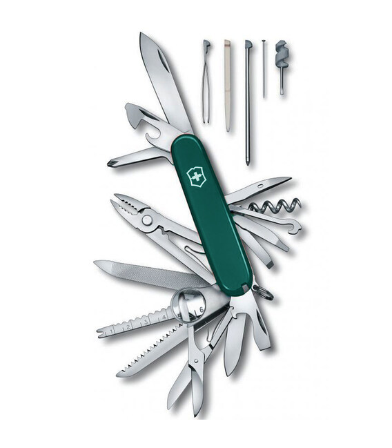 Victorinox SWISS CHAMP (зелений) – швейцарський багатозадачний ніж 91 мм на 33 функції. Представляє колекцію середніх ножів Victorinox і є рекордсменом за кількістю інструментів. Це технічно та естетично досконалий кишеньковий ніж із безліччю функцій та безмежними можливостями. Всі інструменти гарантують бездоганну, довговічну роботу, не люфлять. Ножовий замок Slip-joint – це перевірена часом конструкція, яка фіксує лезо в положенні до руків’я та надійно захищає від закидання під час роботи.Інформація про складаний ніж Victorinox SWISS CHAMP [1.6795.4]✔ Виготовлений із висококласної неіржавної сталі.✔ Зелені накладки-руків’я з міцного пластика з логотипом бренду.✔ 33 функції.✔ Комфортна вага: 185 г✔ Середній розмір ножа Victorinox (довжина х ширина х товщина), мм: 91 х 26 х 33✔ На ніж поширюється довічна гарантія якості.✔ Картонна коробочка з оригінальним сертифікатом.✔ Виготовлено у Швейцарії.1. велике сталеве лезо2 лезо меншого розміру3. штопор4-5. консервний ніж + плоска викрутка 3 мм6-8. відкривачка для пляшок + плоска викрутка 6 мм + інструмент для зачистки дроту9. шило-дірокол10. хрестова викрутка 1/211. ножиці12. багатофункціональний гачок13. пилка по дереву14-17. рибочистка з інструментом для вилучення рибальських снастей + лінійка (в см) + лінійка (в дюймах)18-21. пилка по металу + напилок + пилочка для нігтів + очищувач для нігтів22. плоска викрутка 2,5 мм23. долото 4 мм24-26. плоскогубці + кусачки + інструмент для обтискання дроту27. кулькова ручка28. збільшувальне скло29. міні викрутка (фіксується у штопорі)30. пінцет у передній накладці31. зубочистка в задній накладці32. сталева шпилька33. кільце для кріплення