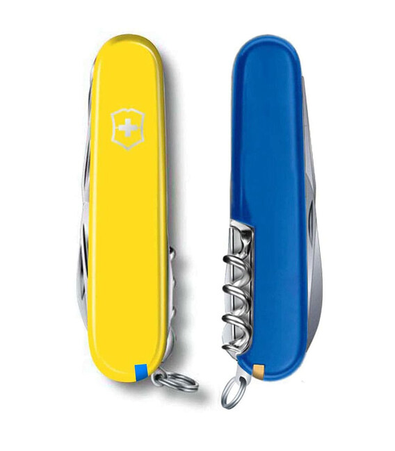 Victorinox HUNTSMAN UKRAINE з жовто-синіми накладками – швейцарський мультизадачний ніж 91 мм на 15 функцій. Обмежена пропозиція у кольорах української державної символіки. Бездоганна швейцарська якість з частинкою української душі.Модель Huntsman - кишеньковий армійський ніж із завидним функціоналом для міської та польової активності. Містить зручні ножиці з пружинним механізмом, якісну пилку по дереву та два леза різної довжини для виконання різнопланових робіт. Комбіновані інструменти поєднують відкривачки для пляшок та консервів із плоскими викрутками на кінці. Багатозадачний гачок, штопор та шило з вушком для шиття. У торцях накладок ховається пінцет та пластикова зубочистка. Сталеве кільце, щоб прикріпити ніж до ланцюжка або темляка. Всі інструменти гарантують бездоганну роботу та не люфлять.Інформація про складаний ніж HUNTSMAN UKRAINE [1.3713.8.2]✔ Ексклюзивний ніж із патріотичної колекції Huntsman Ukraine.✔ Жовто-сині накладки з удароміцного пластика.✔ Ніж швейцарського виробництва з першокласної неіржавної сталі.✔ 15 функцій.✔ Вага: 97 г✔ Кишеньковий ніж Victorinox середнього розміру (довжина х ширина х товщина), мм: 91 х 26 х 21✔ На ніж поширюється довічна гарантія якості.✔ Картонна подарункова коробка з вкладишем-сертифікатом.✔ Виготовлено у Швейцарії.1. велике лезо2. ножиці з пружинним механізмом3. пилка по дереву4. лезо меншого розміру5. відкривачка6. – плоска викрутка 6 мм7. – паз для зачистки ізоляції з дроту8. консервний ніж9. – плоска викрутка 3 мм10. штопор11. гачок12. шило з вушком для шиття (дірокол/кернер)13. синій пінцет14. зубочистка15. сталеве кільце для кріплення Оригінальна продукція, професійний гарантійний сервіс та швидка доставка.