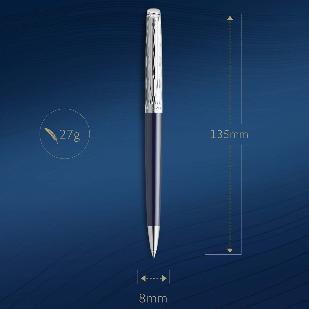 Французька кулькова ручка Waterman HEMISPHERE L’Essence du Bleu PT BP з темно-синім глянцевим лаком і фірмовим хвилястим візерунком Waterman, який нагадує брижі річки Сени. Різьблені хвилі Waterman на ковпачку – впізнаваний елемент дизайну бренду, представлений у багатьох преміальних колекціях. Ще однією рисою, що втілює любов до Парижа, є скошений торець ковпачка колекції Hemisphere, що символізує оцинковані паризькі дахи. Елегантна тонка ручка оснащена роздвоєним затискачем Waterman, а за розкіш відповідає паладієве оздоблення. Кулькова ручка Hemisphere забезпечує тривале та надійне використання.Інформація про кулькову ручку Waterman HEMISPHERE L’Essence du Bleu PT (2166470)✔ Темно-синє лакове покриття на корпусі.✔ Фірмовий хвилеподібний візерунок, висічений на латунному ковпачку.✔ Деталізація – паладієве покриття для надання оздобленню преміального класу.✔ Поворотний механізм ковпачка для активації/деактивації стрижня.✔ Спеціально розроблений кульковий стрижень зі швидковисихаючим чорнилом.✔ У наборі стрижень Waterman із середньою товщиною лінією письма та синім чорнилом.✔ Подарунковий футляр преміум-класу.✔ Виготовлено у Франції.У нашому магазині великий вибір оригінальних ручок WATERMAN/Ватерман (Франція).Швидка доставка по Україні від chemodanoff.com.ua.