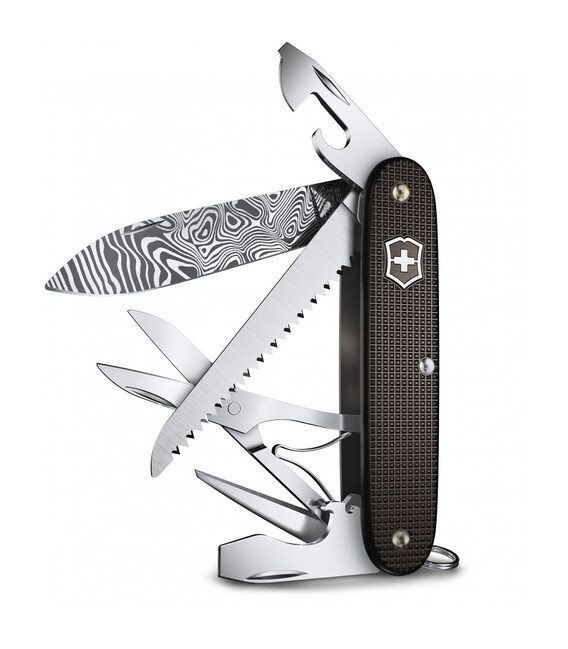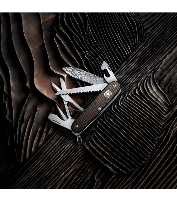 Лімітований складаний ніж Victorinox FARMER X Damast 93мм / 10 функцій / коричневі рифлені накладки / кернер / пилка по дереву / лезо з дамаської сталі (Lim.Ed. 2024) 0.8271.J24 (Швейцарія) Гарантія: довічна