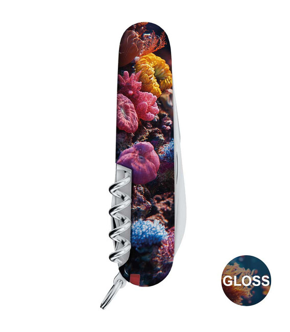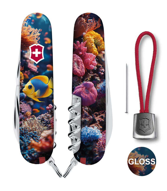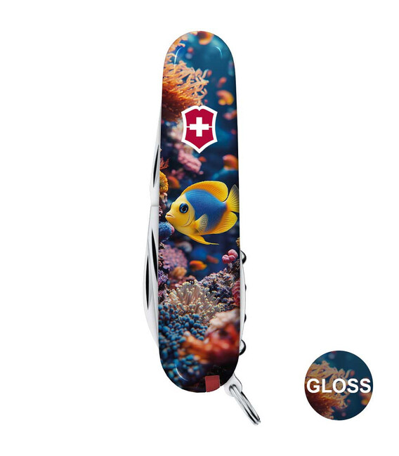 Кишеньковий ніж SPARTAN DESIGN <Коралова рибка> з якісним кольоровим друком на обох накладках, покритих глянцевим лаком. Спеціальна естетична пропозиція для українських шанувальників та колекціонерів бренду Victorinox. Ідеальний варіант цікавого подарунка у красивій упаковці з прозорим віконцем, що дозволяє бачити дизайн одразу та підкреслює ексклюзивність подарунка.Багатофункціональний кишеньковий ніж SPARTAN (12 функцій) у цьому ексклюзивному дизайні поповнився шпилькою та кольоровим темлячком. Базовий для середніх складаних ножів набір інструментів з компактним дворядним розташуванням, який завжди знайде застосування в побуті та дозвіллі; у місті та на природі.Детально про ніж Victorinox 1.3603.R2010pk✔ Спецвипуск VICTORINOX DESIGN.✔ Ексклюзивний дизайн <Коралова рибка> у комплектації ножа SPARTAN.✔ Якісний повноколірний цифровий друк на оригінальних пластикових накладках.✔ Накладки покрито глянцевим захисним лаком (GLOSS).✔ Заміна пінцета та зубочистки на червоні.✔ До комплектації додано шпильку та темляк.✔ Кількість функцій: 12+2.✔ Середній розмір складаного ножа: довжина 91 мм – ширина 26 мм – товщина 14 мм✔ Вага ножа: 59 г✔ Подарункова коробка Victorinox з прозорим віконцем (всередині – оригінальний сертифікат-гарантія).✔ Ніж швейцарського виробництва із висококласної неіржавної сталі.✔ Персоналізація друком виконана на високоякісному професійному обладнанні в Україні, а дизайн узгоджено з компанією Victorinox.1. основне лезо 6 см2. менше лезо 3,5 см3-5. відкривачка для пляшок з плоскою викруткою 6 мм на кінці та пазом для ізоляції6-7. консервний ніж із плоскою викруткою 3 мм на кінці8. штопор9. шило з функцією кернера або дірокола10. пінцет у передній накладці11. зубочистка у задній накладці12. сталеве кільце13. шпилька (у слоті біля штопора)14. червоний темляк-брелок Victorinox