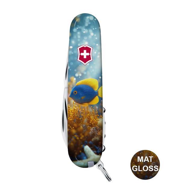 Кишеньковий ніж CAMPER DESIGN <Жовто-блакитна рибка> з повноколірним друком на обох накладках та комбінованим матово-глянцевим покриттям. Спеціальна естетична пропозиція для українських шанувальників та колекціонерів бренду Victorinox. Ідеальний варіант цікавого подарунка у красивій упаковці з прозорим віконцем, що дозволяє бачити дизайн одразу та підкреслює ексклюзивність подарунка.Ця ексклюзивна модель CAMPER отримала додатково в комплектацію шпильку та кольоровий темлячок. Кишеньковий ніж Victorinox з дуже гострою пилкою по дереву, тому ніж сподобається туристам та всім, хто любить проводити час на свіжому повітрі. Ідеальний для середніх складаних ножів набір інструментів із компактною трирядною конфігурацією.Детально про ніж Victorinox 1.3613.7.R2020pk✔ Спецвипуск VICTORINOX DESIGN.✔ Ексклюзивний дизайн <Жовто-блакитна рибка> у комплектації ножа CAMPER.✔ Якісне повноколірне цифрове задруковування на оригінальних пластикових накладках.✔ Матово-глянцевий дизайн (MAT/GLOSS): накладки покрито матовим лаком, а рибка – глянцевим.✔ Заміна зубочистки на синю.✔ До комплектації додано шпильку та темляк.✔ Кількість функцій: 13+2.✔ Середній розмір складаного ножа: довжина 91 мм – ширина 26 мм – товщина 18 мм✔ Вага ножа: 74 г✔ Подарункова коробка Victorinox з прозорим віконцем (всередині – оригінальний сертифікат-гарантія).✔ Ніж швейцарського виробництва із висококласної неіржавної сталі.✔ Персоналізація друком виконана на високоякісному професійному обладнанні в Україні, а дизайн узгоджено з компанією Victorinox.1. основне лезо 6 см2. менше лезо 3,5 см3-5. відкривачка для пляшок з плоскою викруткою 6 мм на кінці та пазом для ізоляції6-7. консервний ніж із плоскою викруткою 3 мм на кінці8. пилка по дереву9. шило з функцією кернера або дірокола10. пінцет у передній накладці11. зубочистка у задній накладці12. штопор13. сталеве кільце14. шпилька (у слоті біля штопора)15. синій темляк-брелок Victorinox