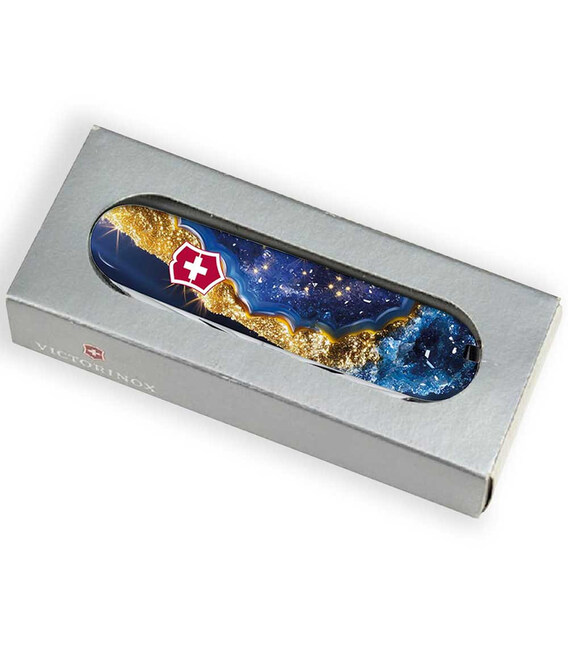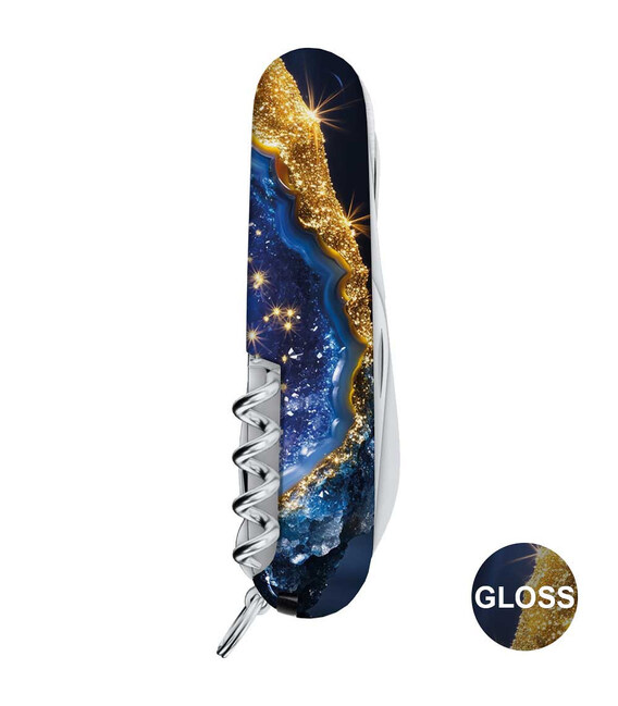 Кишеньковий ніж HUNTSMAN DESIGN <Золотисто-блакитний кристал> з повноколірним друком на обох накладках та глянцевим покриттям. Спеціальна естетична пропозиція для українських шанувальників та колекціонерів бренду Victorinox. Ідеальний варіант цікавого подарунка у красивій упаковці з прозорим віконцем, що дозволяє бачити дизайн одразу та підкреслює ексклюзивність подарунка.Модель Huntsman - кишеньковий армійський ніж із завидним функціоналом для міської та польової активності. Містить зручні ножиці з пружинним механізмом, якісну пилку по дереву та два леза різної довжини для виконання різних робіт. Крім стандартних для серії інструментів, цей ексклюзивний Climber отримав додатково комплектацію ще фірмовий темлячок і шпильку. Ідеальний набір інструментів з чотирирядною конфігурацією та 15 основними функціями.Детально про ніж Victorinox 1.3713.3.R2040pk✔ Спецвипуск VICTORINOX DESIGN.✔ Ексклюзивний дизайн <Золотисто-блакитний кристал> у комплектації ножа HUNTSMAN.✔ Якісне повноколірне цифрове задруковування на оригінальних пластикових накладках.✔ Накладки покрито глянцевим лаком (GLOSS).✔ Заміна пінцета та зубочистки на чорні.✔ До комплектації додано шпильку та чорний темляк-брелок.✔ Кількість функцій: 15+2.✔ Середній розмір складаного ножа: довжина 91 мм – ширина 26 мм – товщина 18 мм✔ Вага ножа: 97 г✔ Подарункова коробка Victorinox з прозорим віконцем (всередині – оригінальний сертифікат-гарантія).✔ Ніж швейцарського виробництва із висококласної неіржавної сталі.✔ Персоналізація друком виконана на високоякісному професійному обладнанні в Україні, а дизайн узгоджено з компанією Victorinox.1. основне лезо 6 см2. додаткове лезо 3,5 см3-5. відкривачка, комбінована з викруткою 6 мм та пазом для ізоляції.6-7. консервний ніж з викруткою 3 мм8. пилка по дереву9. ножиці з пружинним механізмом10. штопор11. шило з функцією кернера або дірокола12. пінцет у передній накладці13. зубочистка у задній накладці14. сталевий гачок15. кільце для кріплення16. сталева шпилька17. темляк Victorinox
