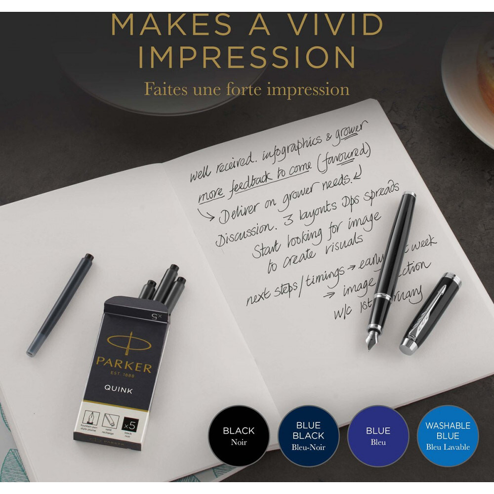 Картриджі Parker Quink Washable з чорнилом, що змивається. Зберігають високоякісне чорнило, тому їх заміна - це чистий процес, і вони призначені для всіх перових ручок Parker. Упаковка містить 5 змінних картриджів.У наборі 5 шт.Колір чорнила - синій.Тип чорнила: змиване.Упаковка – картонний блістер.Країна: Франція.Серійний номер: 1950208