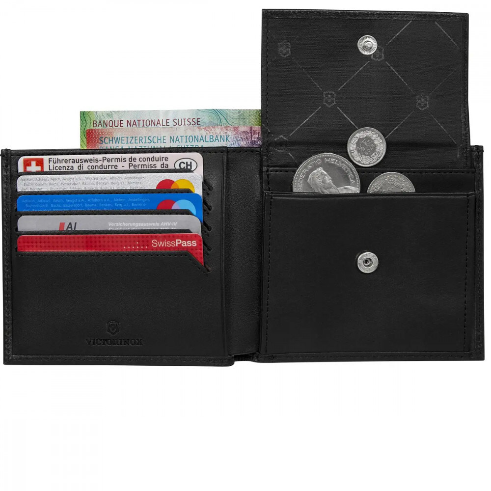 Victorinox Travel ALTIUS ALOX Deluxe (Black) – чоловічий шкіряний гаманець із RFID-захистом та монетницею. Виконано у класичному чорному кольорі з металевим шильдом-логотипом Victorinox. Деталізація підкреслена чіткою естетикою рифлених алюмінієвих накладок кишенькових ножів із колекції Alox.Компактний та максимально функціональний дизайн без застібок. Цей гаманець спроектовано з увагою до кожної дрібниці, наприклад, куточки слотів мають невеликий зріз для зручного діставання карток. Ви матимете достатньо простору для зберігання всього необхідного.Горизонтально орієнтована модель із високоякісної натуральної шкіри, яка надає розкішного вигляду. Завдяки технології обробки шкіри (рослинне дублення) матеріал чудово зберігає привабливий зовнішній вигляд навіть після декількох років. Додайте до цього підкладку з RFID-захистом, який зберігає всі дані вашої кредитної картки в безпеці, і ви точно готові до повсякденних справ.Інформація про портмоне Altius Alox Deluxe 611571✔ Матеріал: гладка шкіра рослинного дублення.✔ RFID-захисна підкладка.✔ Дизайн у два складання без застібок.✔ Компактні розміри (ширина х висота х товщина): 11 х 10 х 2 см.✔ Бренд: Victorinox Travel, Швейцарія.✔ Глобальна 2-річна гарантія якості від виробника.• Відділення для банкнот.• 5 слотів для карток.• Монетниця на кнопці.• Мікросітчастий слот для посвідчення особи на клапані монетниці.