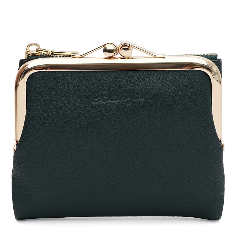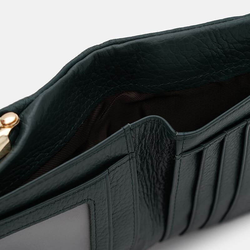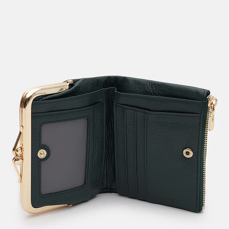 Жіночий шкіряний гаманець закривається на кнопку. Має 1 відділення під купюри, 8 відділів під карти, 1 монетницю, 1 зовнішню кишеню на блискавці. Підкладка текстиль.