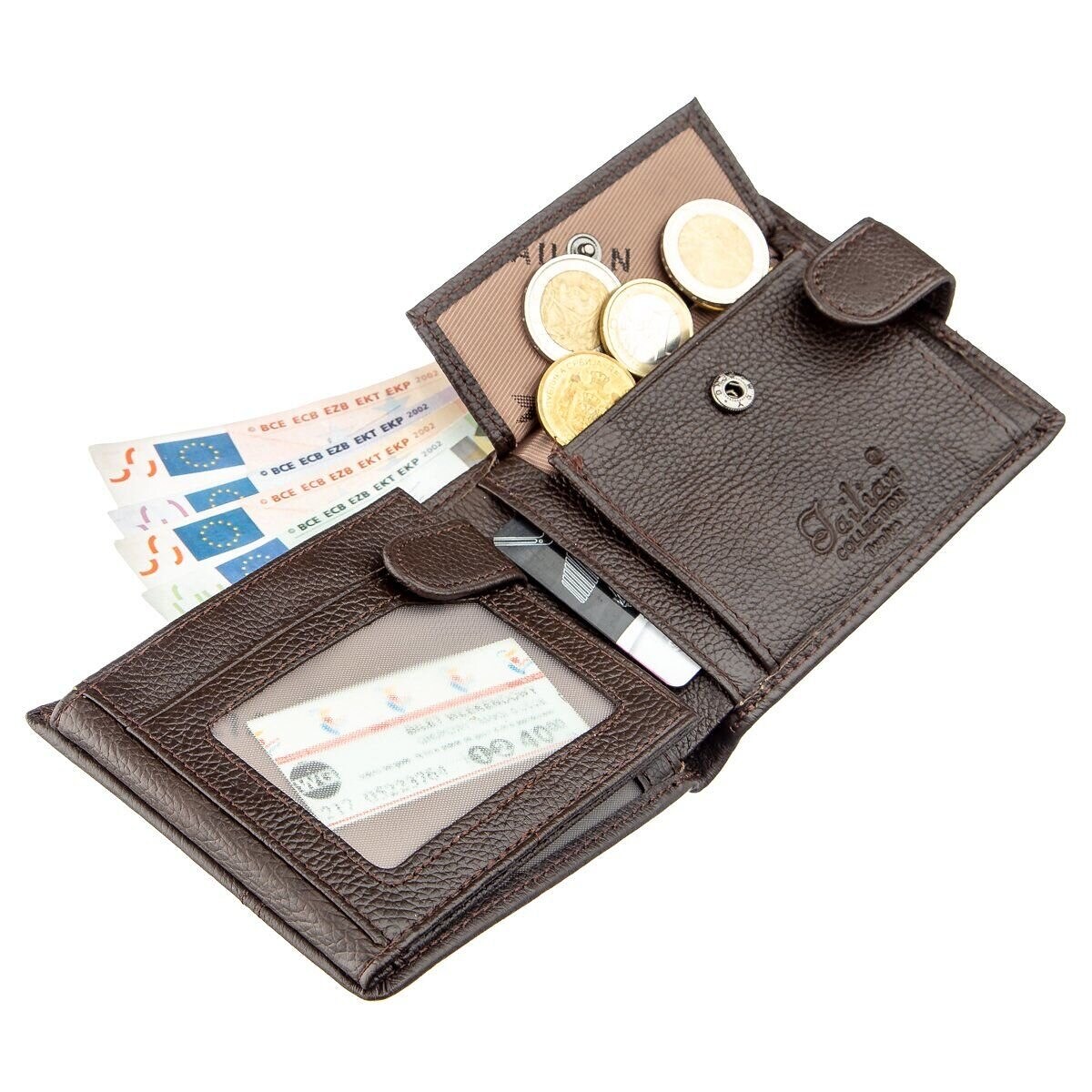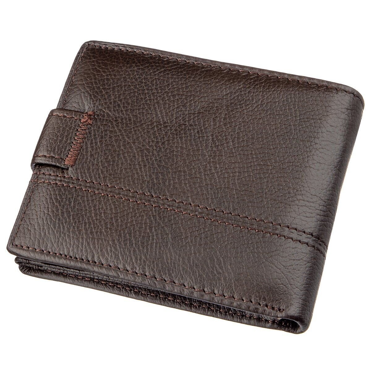 Горизонтальний, шкіряний чоловічий гаманець з натуральної шкіри. Модель гаманця з монетницею на кнопці і трьома відділеннями під прозорою плівкою. Гаманець не займає багато місця і легко поміститься в чоловічу сумку. Модель підійде для всіх типів купюр. По краях аксесуар прошитий рівним рядком. Усередині модель виконана зі шкіри в поєднанні з текстильної підкладкою коричневого кольору.