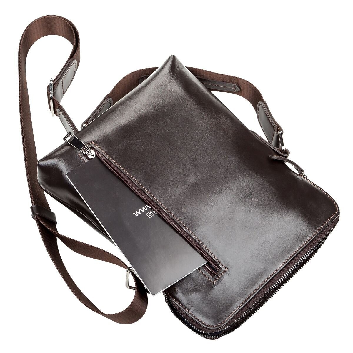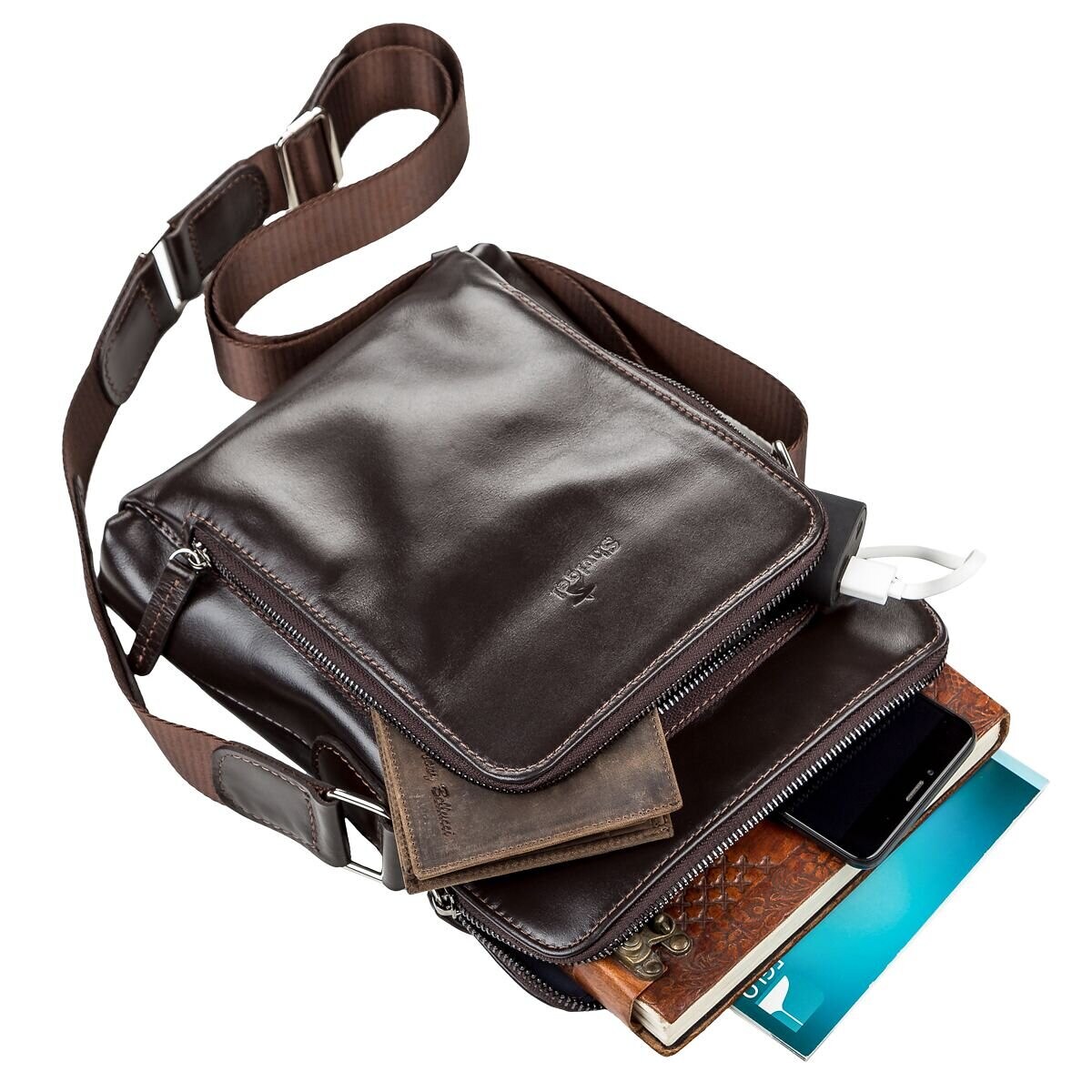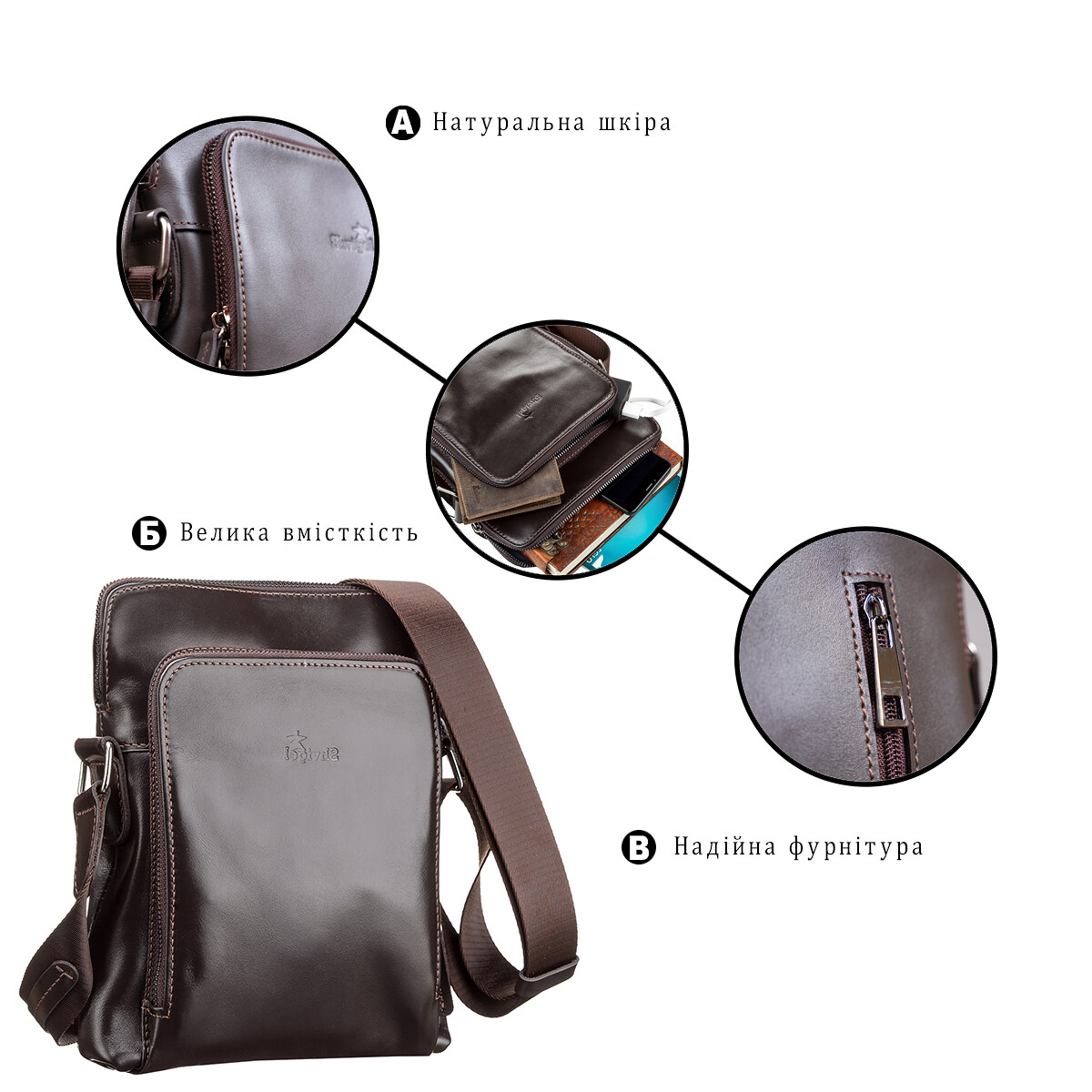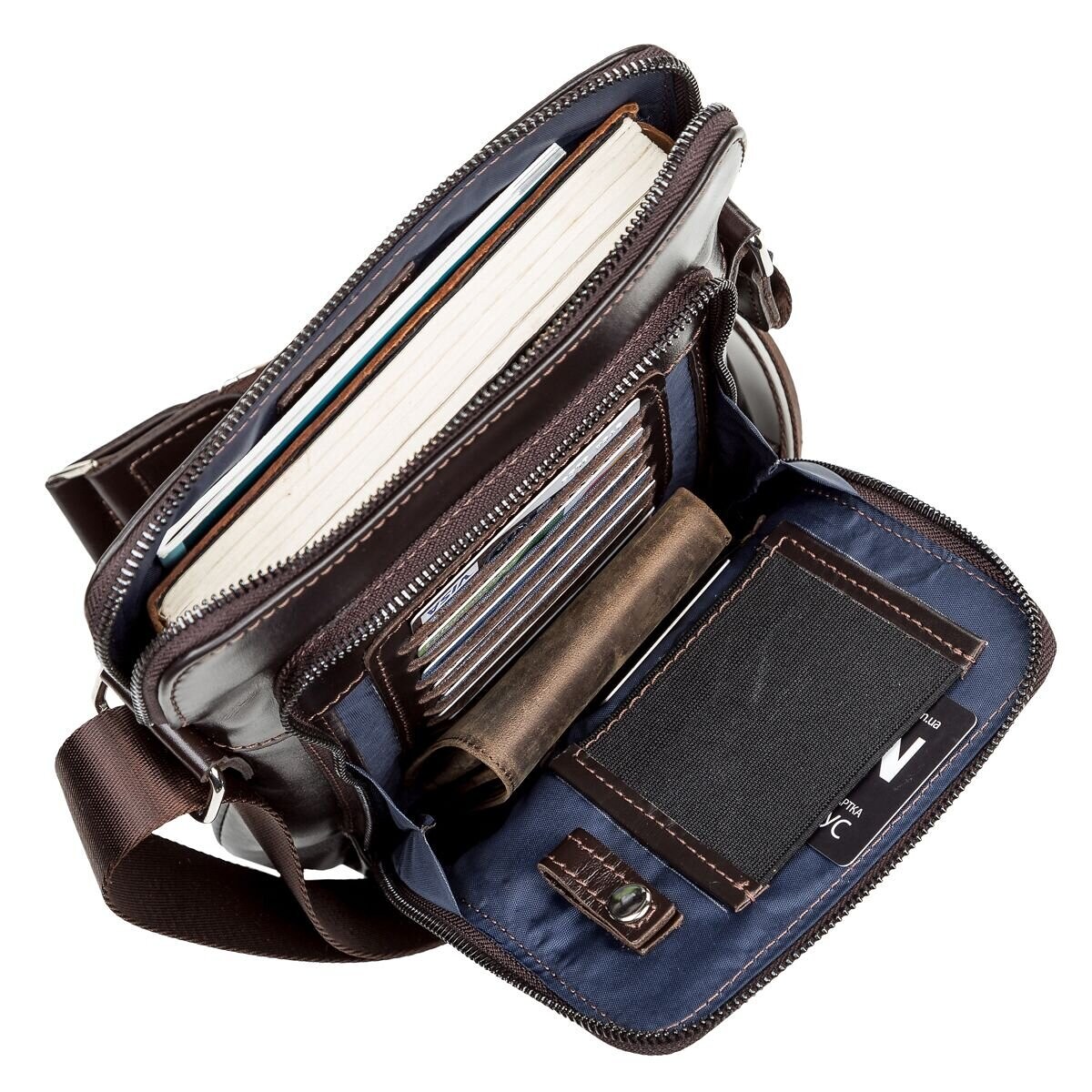 Коричнева чоловіча сумка, з натуральної гладкої шкіри, невеликого розміру. Дуже функціональна і зручна. Особливість дизайну дозволить чоловікові носити з собою багато потрібних дрібниць.