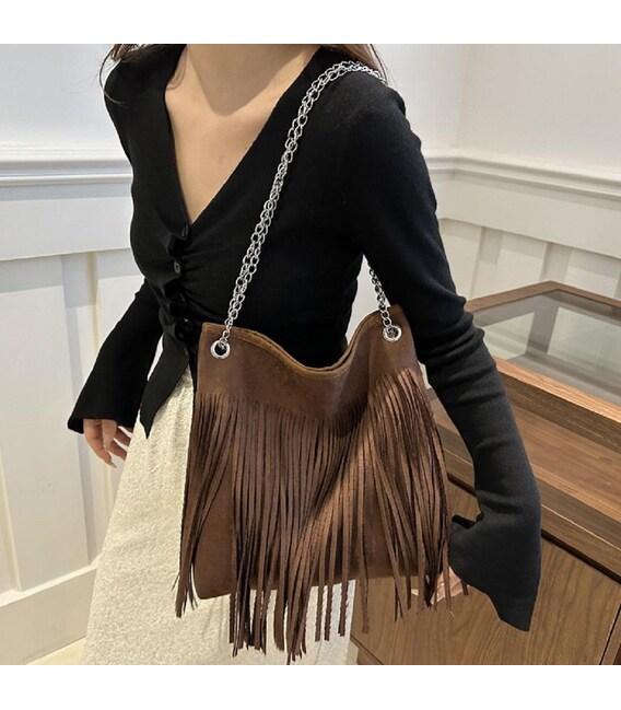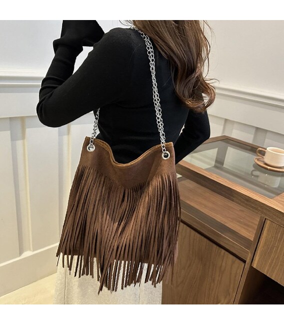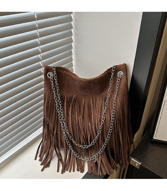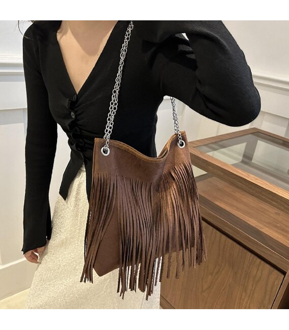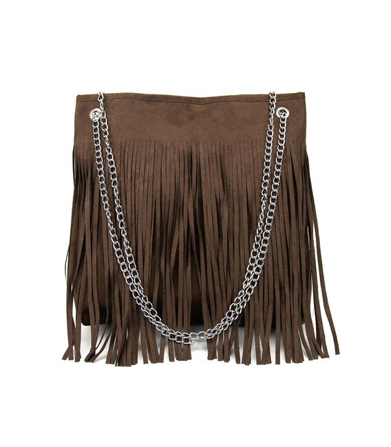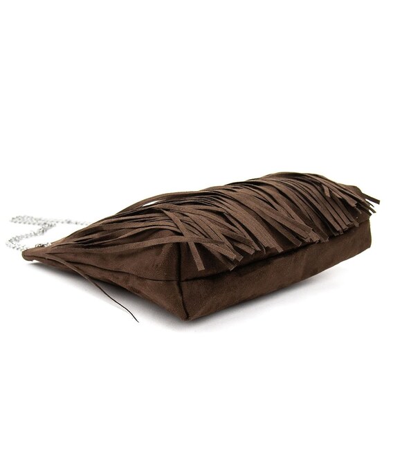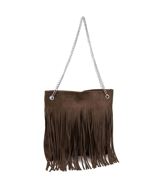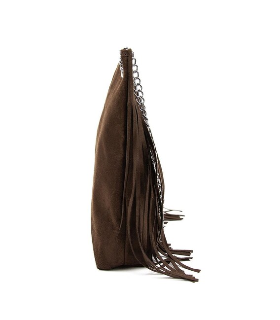 Замшева сумочка на ланцюжку з бахромоюОсобливості: розміри 28 x 30 x 6 см. Сумка має одне основне відділення, яке закривається на кнопку, довгі ручки на ланцюжкуПідкладка: без підкладки Колір: темно-коричневий Колір фурнітури: сріблоЗнайшли цю модель дешевше? Зв'яжіться з нами, і ми запропонуємо Вам найнижчу ціну в Україні, тому що виробник цього товару.