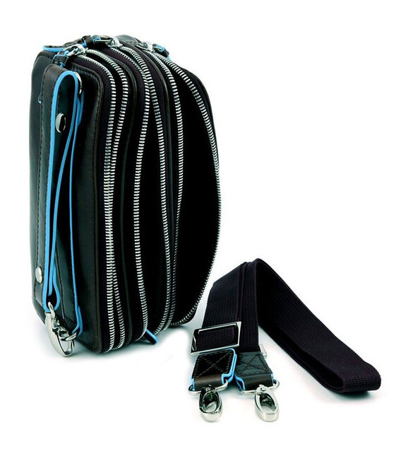 Чоловіча шкіряна барсетка Piquadro чорного кольору з блакитною окантовкою, призначена для дрібних речей: грошей, телефона, документів. Барсетка на 3 відділення на блискавці. Має ремінець для носіння на руці. Матеріал шкіра. Розмір 19,5х10х6,5 см.