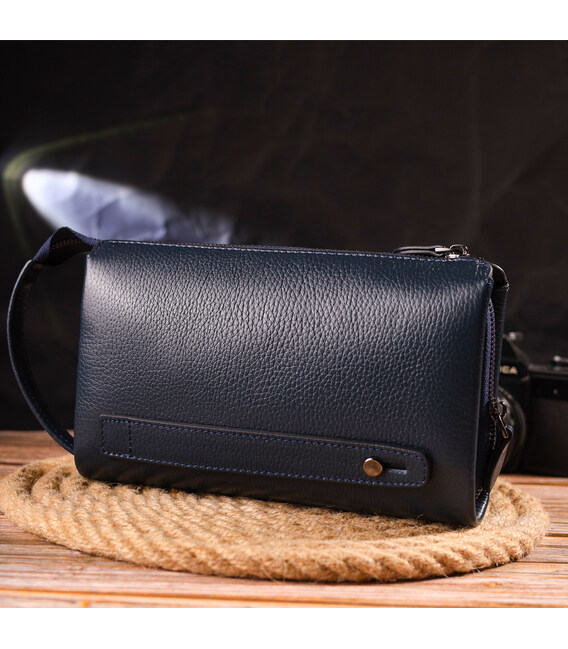 Місткий клатч для чоловіків з натуральної якісної шкіри. Аксесуар має одне основне відділення, всередині якого дві бічні кишені, одна з них на блискавці та кишеня-перегородка на блискавці. Зовні у виробі розташовані дві кишені на лицьовій та тильній стороні. Внизу аксесуара є ремінець для носіння на руці, що дуже зручно у використанні, також є незнімна ручка. Чим зручний клатч - у нього Ви можете покласти все необхідне і все буде під рукою.