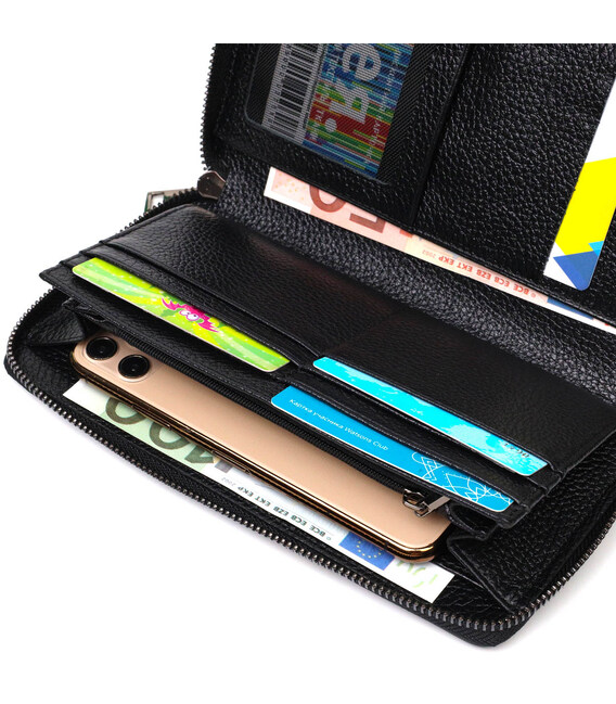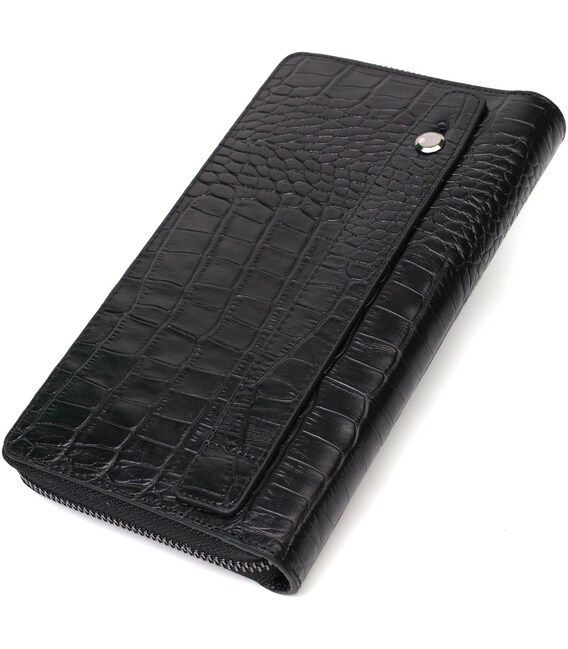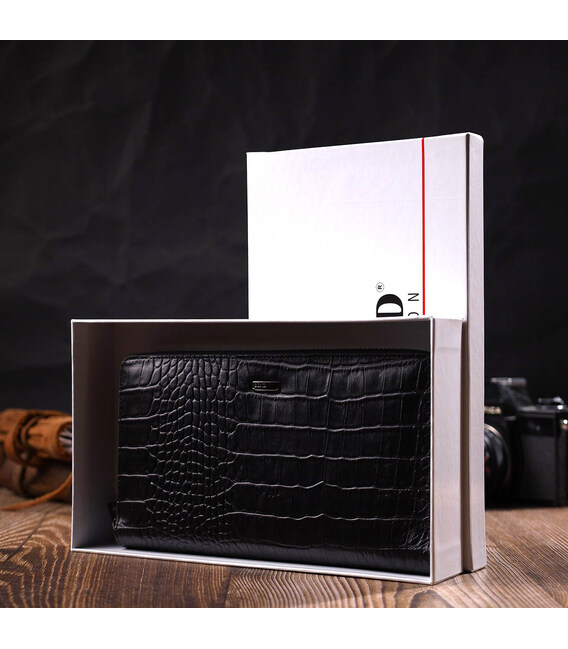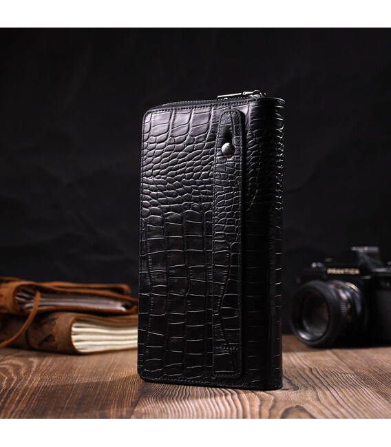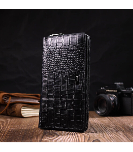 Зручний чоловічий клатч із натуральної шкіри з тисненням під крокодила, гаманець закривається на блискавку, всередині можна без проблем розміщувати паперові банкноти, банківські картки та навіть смартфон. Аксесуар складається з двох відділень для купюр, двох прилеглих кишень, сімнадцяти слотів для кредиток та монетниці на блискавці. Є також ручка долоні на тильній стороні клатчу. Продається гаманець у гарній коробці від виробника. Якісний і надійний клатч - саме такий аксесуар повинен бути у кожної людини, що поважає себе.