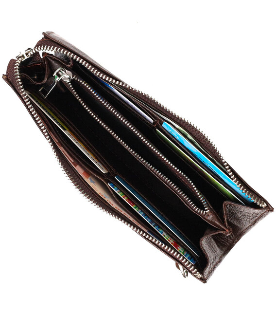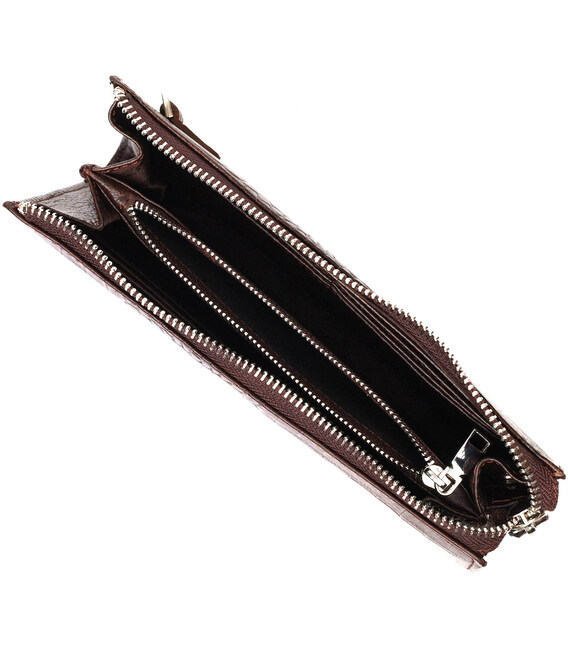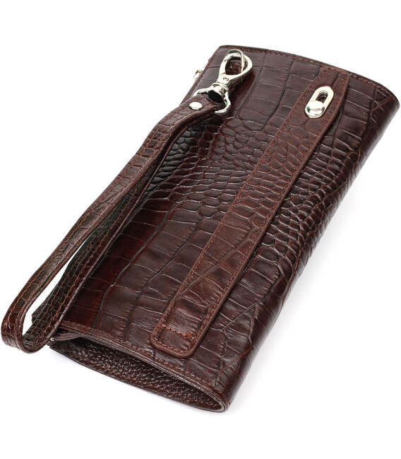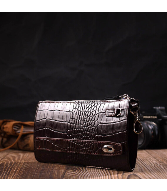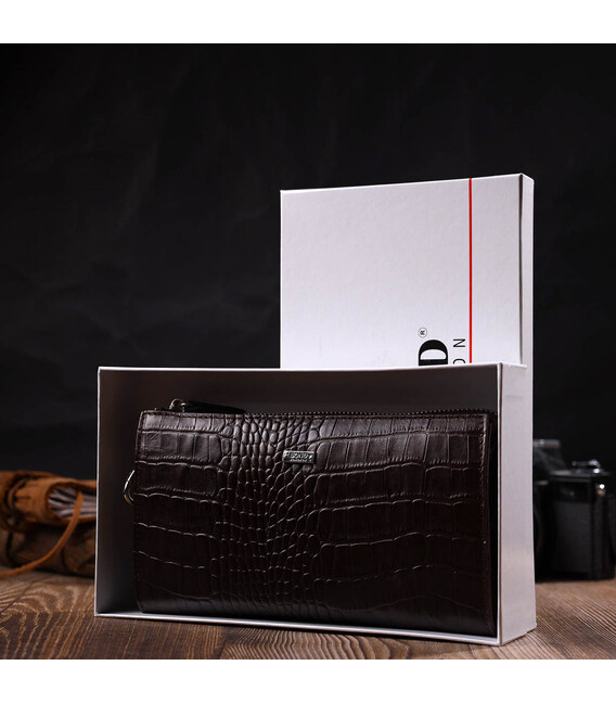 Практичний чоловічий клатч із натуральної шкіри з тисненням під крокодила, закривається виріб на блискавку, всередині можна без проблем розміщувати паперові банкноти, банківські картки та навіть смартфон. Аксесуар складається з двох відділень для купюр, двох прилеглих кишень, дванадцяти слотів для кредиток та монетниці на блискавці. Є також ручка для долоні на тильній стороні клатчу та знімний кистьовий ремінь. Продається клатч у красивій коробці від виробника. Якісний і надійний клатч - саме такий аксесуар повинен бути у кожної людини, що поважає себе.