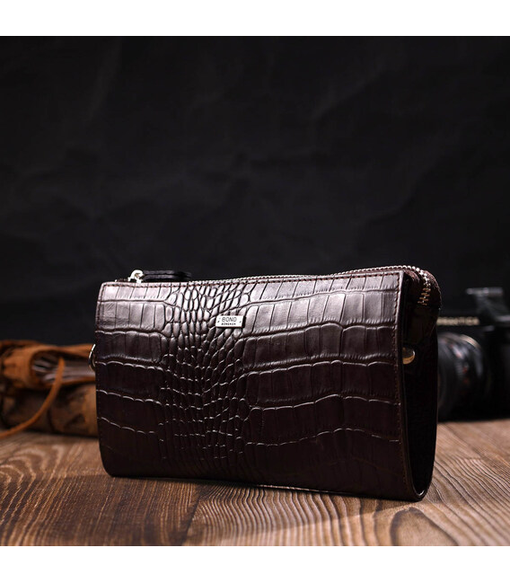 Стильний чоловічий клатч із натуральної шкіри з тисненням під крокодила BOND 22048 Коричневий