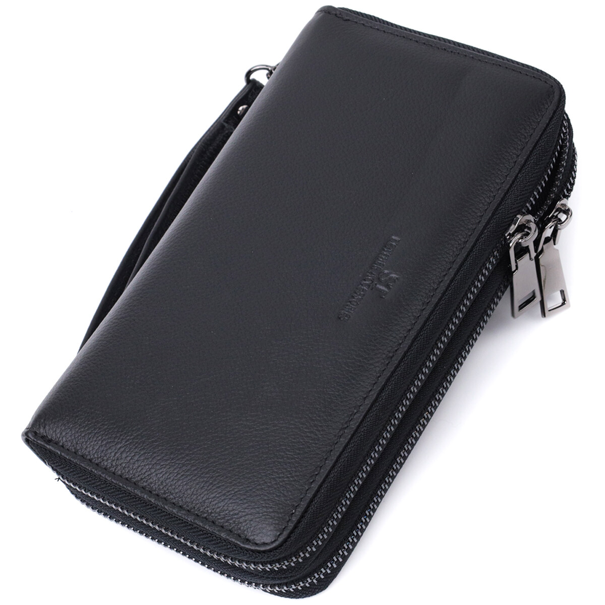 Просторий чоловічий клатч на два автономні відділення з високоякісної шкіри чорного кольору для впевненого у собі ділового чоловіка. Має все необхідне, щоб стати Вам незамінним аксесуаром у повсякденному рутинному житті. Ви легко помістите в нього паперові купюри, телефон, монети, документи і картки. Цей клатч можна носити як у сумці чи портфелі, чи просто як самостійний аксесуар на зап'ястя за допомогою кистьового ремінця, чи просто в руці за допомогою ручки, яка знаходиться на тильній стороні. На лицьовій стороні, вгорі посередині, розташоване тиснення з логотипом виробника, що є запорукою якості виробу. Запакований аксесуар у білу щільну картонну коробку з фірмовим логотипом. Якщо Ви вирішите такий аксесуар подарувати близькій людині, то Вам гарантовано будуть дуже вдячні.