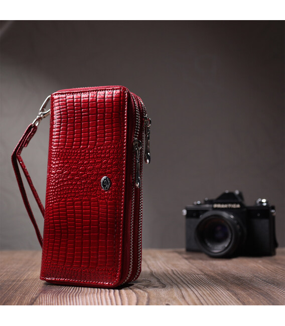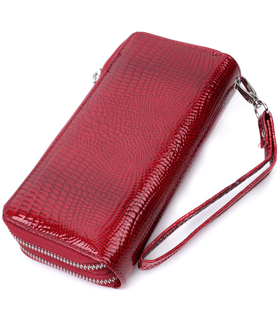 Яскравий жіночий клатч у класичному стилі із натуральної лакованої шкіри з тисненням під рептилію. Для максимальної зручності гаманець розділений на два великі відділення, що закриваються на блискавці. Аксесуар має все необхідне, щоб стати Вам незамінним помічником у повсякденному житті. Ви легко помістите в нього паперові купюри, монети, документи, картки і навіть смартфон. На лицьовій стороні вгорі посередині розташований металевий логотип виробника, що є запорукою якості виробу. Запакований аксесуар у білу щільну картонну коробку з фірмовим логотипом.
