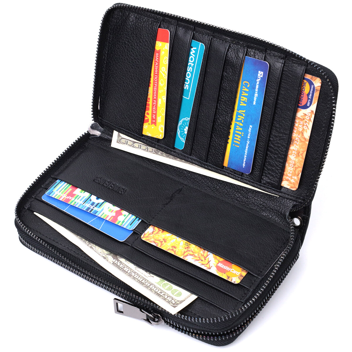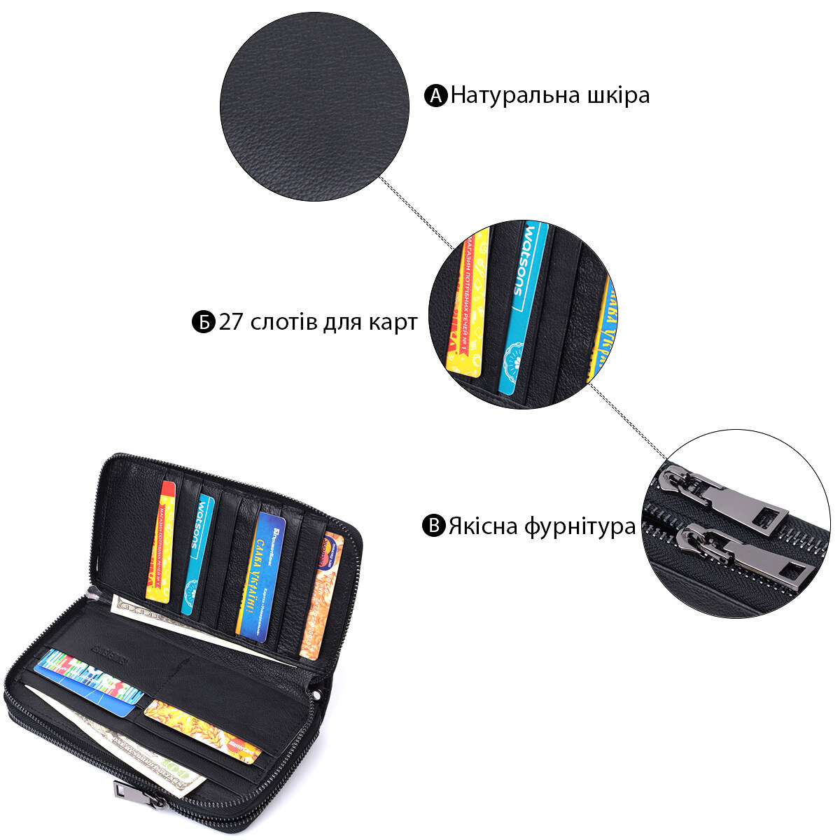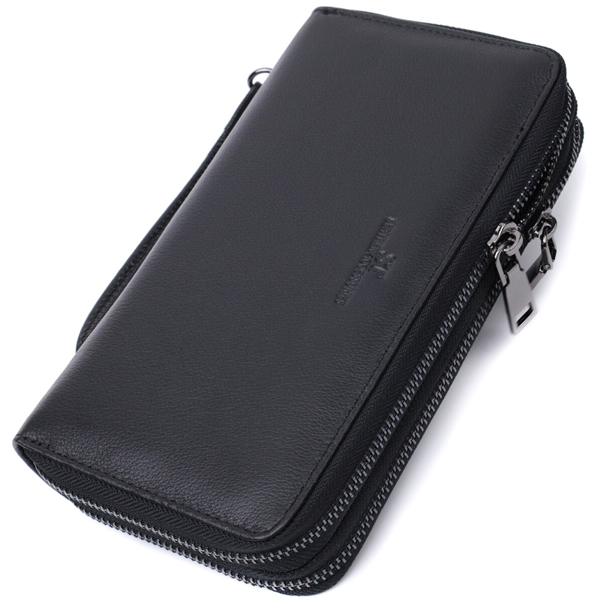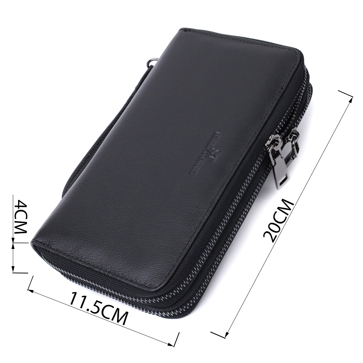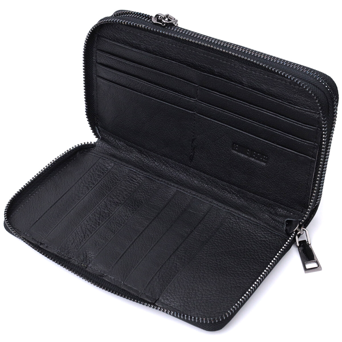 Зручний чоловічий клатч у класичному стилі із натуральної шкіри. Для максимальної зручності гаманець розділений на два великі відділення, що закриваються на блискавці. Аксесуар має все необхідне, щоб стати Вам незамінним помічником у повсякденному житті. Ви легко помістите в нього паперові купюри, монети, документи, картки і навіть смартфон. На лицьовій стороні вгорі посередині розташоване тиснення з логотипом виробника, що є запорукою якості виробу. Запакований аксесуар у білу щільну картонну коробку з фірмовим логотипом.