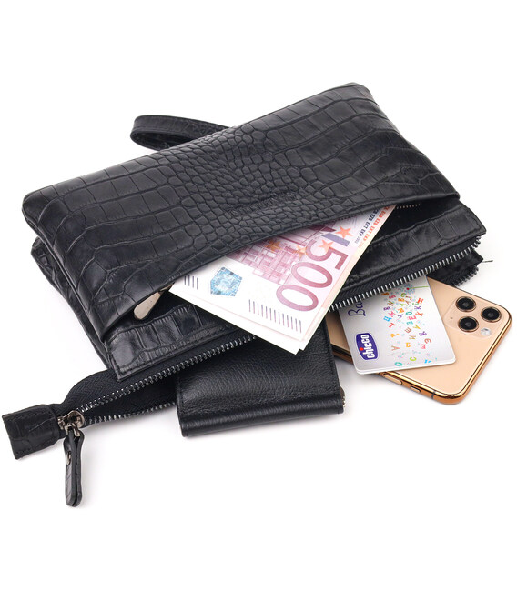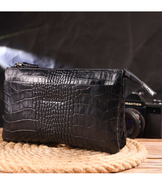 Надійний клатч для чоловіків з натуральної якісної шкіри з тисненням під крокодила. Аксесуар має одне основне відділення, всередині якого дві кишені на блискавках і два осередки для кредитних карток. Зовні у виробі розташовані дві кишені на лицьовій та тильній стороні, що закриваються на блискавку. Внизу аксесуара є ремінець для носіння на руці, що дуже зручно у використанні, також є кистьовий ремінь, що знімається. Чим зручний клатч - у нього Ви можете покласти все необхідне і все буде під рукою.
