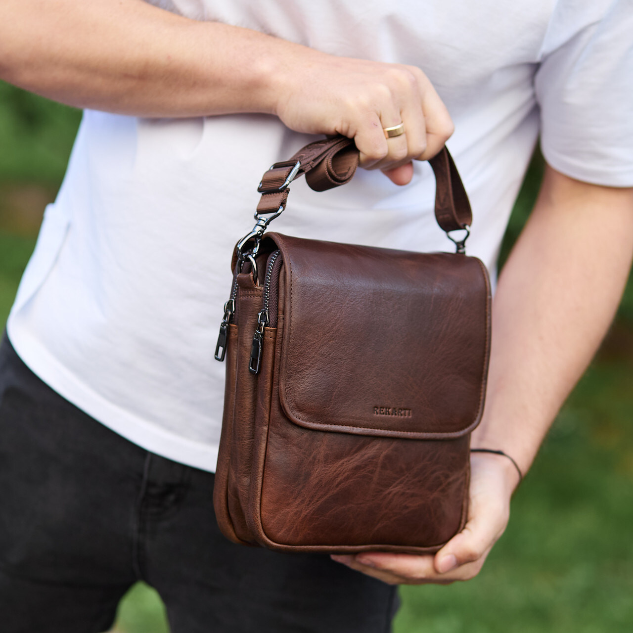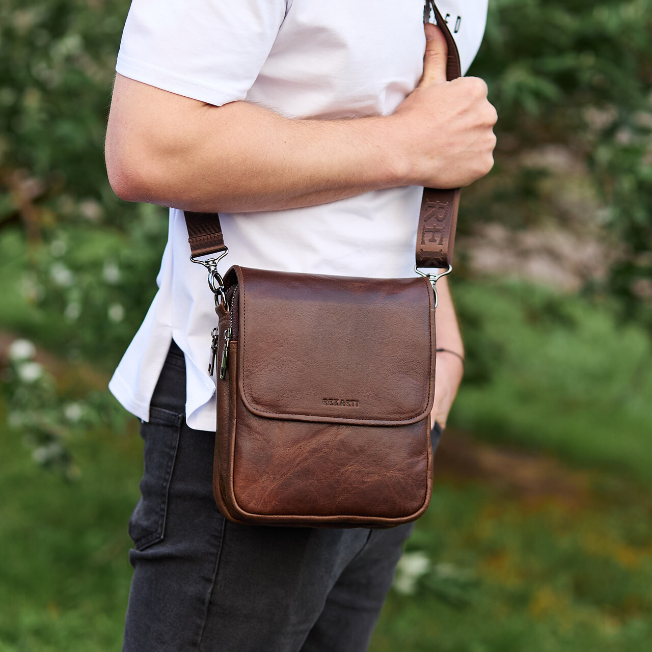 Доволі вмістовна чоловіча сумка через плече, виконана з м'якої високоякісної натуральної шкіри. Два основних відділення рівномірні, одне з них має бокову кишеню на блискавці, а також кишеню відкритого типу. Між основними відділеннями є додаткове відділення на магнітній кнопці. З тильної частини сумки знаходиться кишеня на блискавці, а з лицьової частини – глибоке відділення без застібки під накидкою. Відділення застібаються за допомогою якісної фурнітури. Внутрішнє оздоблення сумки - щільна підкладка. Ремінь сумки текстильний, знімний, надійно кріпиться за допомогою карабіна.