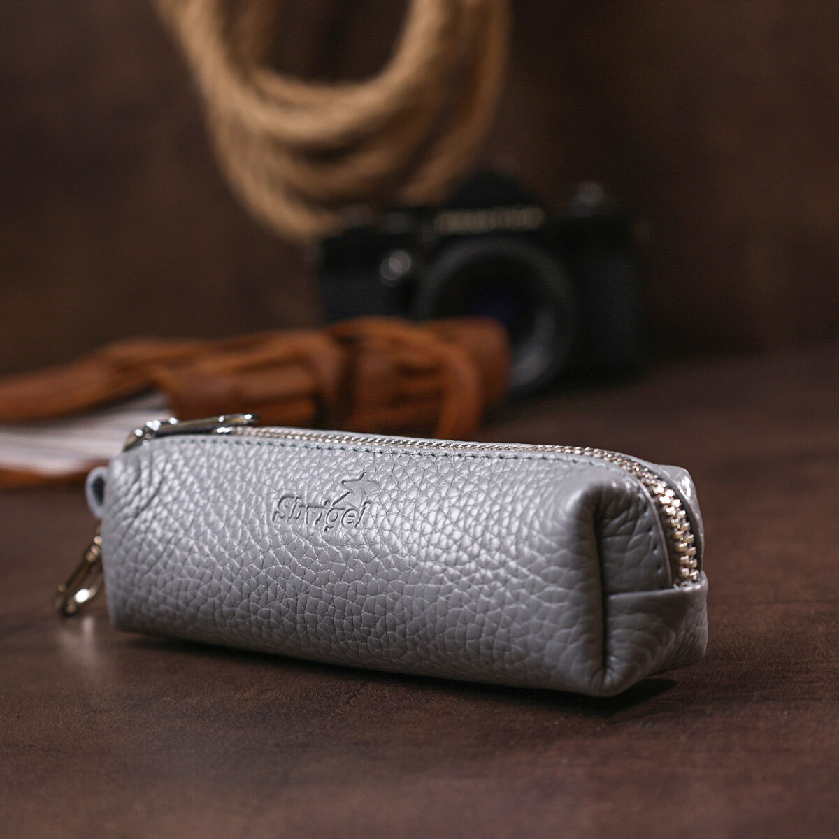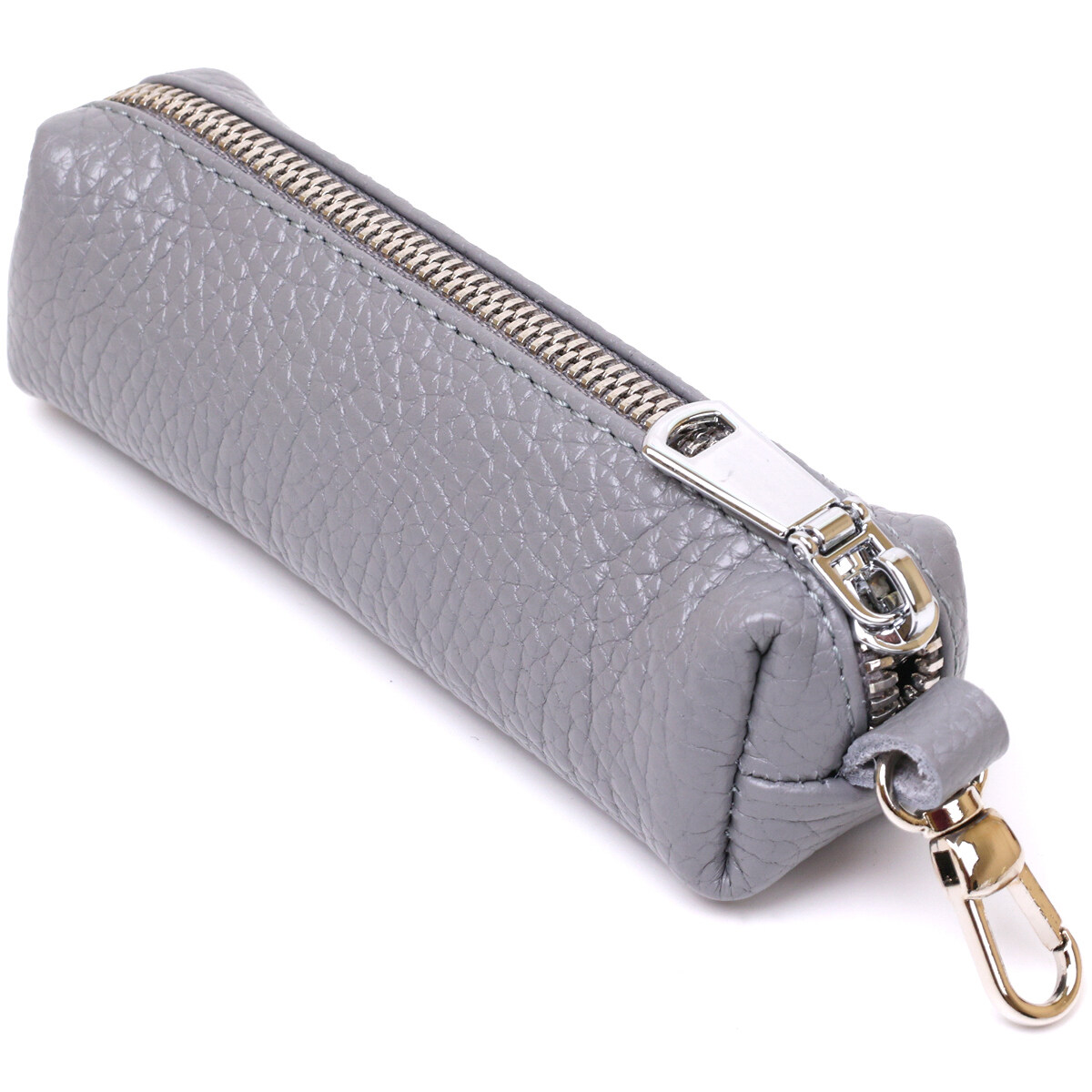 Чудова ключниця у красивому трендовому сірому кольорі. Матеріал виготовлення – натуральна шкіра високої якості із відмінними характеристиками. Закривається аксесуар на блискавку, всередині є металеве кільце для ключів, зовні – карабін. Фактура – зерниста і дуже приємна на дотик.