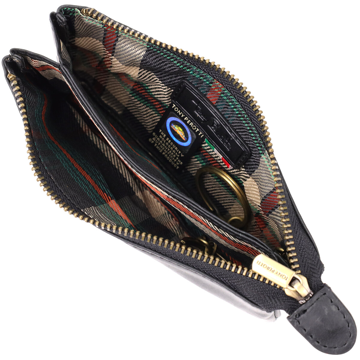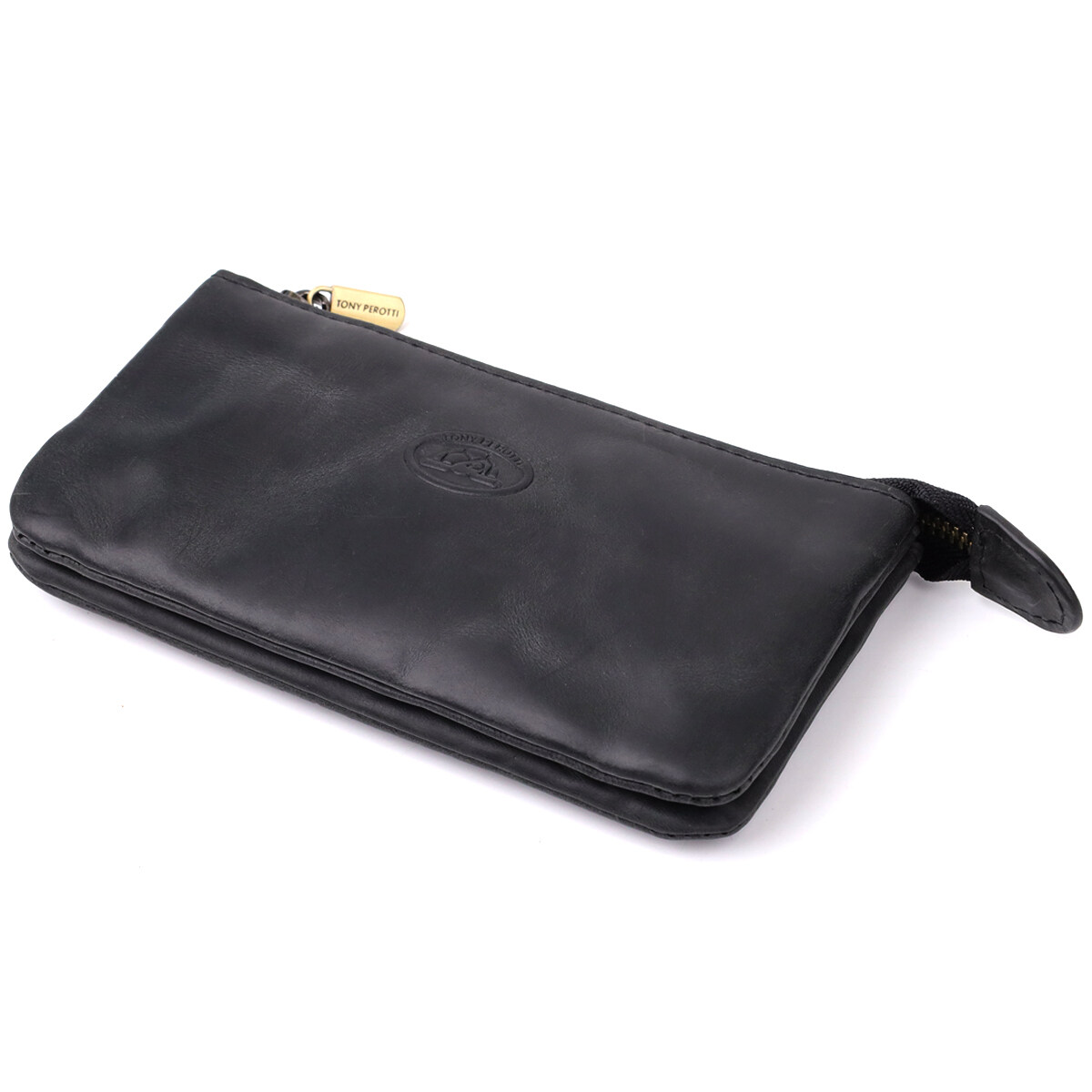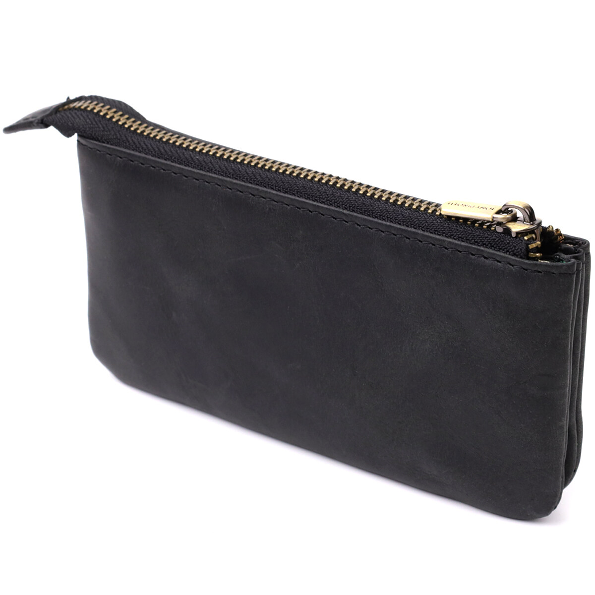 Ключниця з натуральної vintage шкіри в чорному кольорі. Закривається на блискавку – зручно та надійно. Оснащена трьома відділеннями та двома кільцями для ключів. Доповнена брендованою фурнітурою високої якості. Така ключниця поєднує функціональність та елегантність. Підійде для щоденного використання та стане гідним аксесуаром чи подарунком.