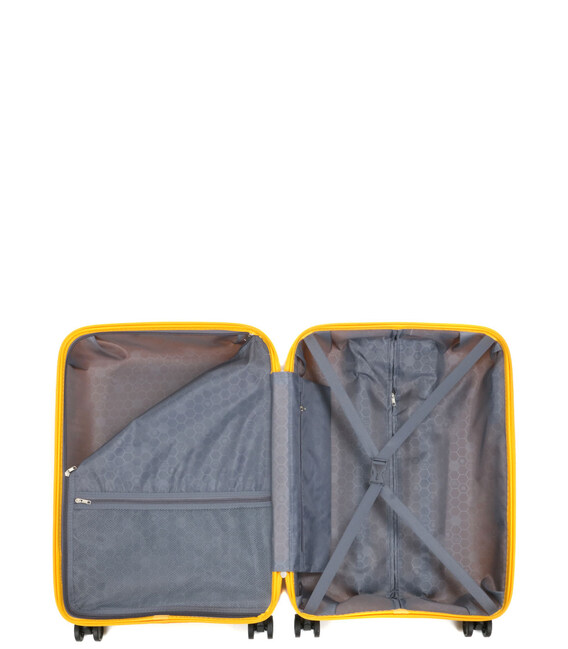 Чотириколісні валізи Worldline Syros мають 2 відділення з текстильною підкладкою, невелику кишеню на блискавці для шнурів живлення та дрібних аксесуарів, велику сітчасту кишеню на блискавці для швидкого візуального огляду вмісту, 2 еластичні ремінці для утримання купи акуратно складеного одягу. і перегородка на блискавці, щоб запобігти проливанню під час відкриття багажу.