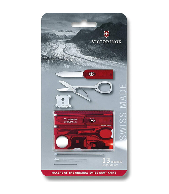 SWISSCARD Lite – корисний набір інструментів Швейцарська картка від компанії Victorinox (Вікторінокс). Має гострий ножик, ліхтарик і комбінований мультиінструмент з 4 викрутками. Функціональний помічник у компактному розмірі, який поміститься навіть у гаманці. Стильний дизайн у фірмовому червоному кольорі з напівпрозорого ударостійкого пластика. Ви будете вражені, скільки функцій заховано на такій маленькій площі.Раціональне розташування всіх інструментів Свісс Кард Лайт забезпечує червоний напівпрозорий корпус-органайзер з назвою та логотипом бренду. Діставати інструменти максимально легко, а у складеному вигляді надійно фіксуються у слотах.Інформація про SwissCard Lite 0.7300.TB1✔ 10 функцій✔ Розмір: 82 х 54 х 4,5 мм (довжина х ширина х товщина)✔ Інструменти з високоякісної неіржавної сталі✔ Червоний напівпрозорий корпус з удароміцного ABS-пластика✔ Упаковка: фірмовий блістер✔ Довічна гарантія на матеріали та збірку від Victorinox AG1. невелике лезо2. ножиці3. вбудований LED-ліхтарик4-7. мультивикрутка Quattro з:- плоска викрутка 3 мм- плоска викрутка 5 мм- хрестова викрутка 00-0- хрестова викрутка 1-28. кулькова ручка9. шпилька з неіржавної сталі10. лінійка (у дюймах)11. лінійка (см)12. збільшувальне скло13. пінцет