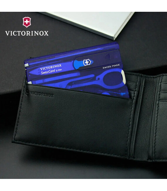 SWISS CARD LITE (синій) від Victorinox – швейцарський мультинабір у легкому та компактному форматі кредитної картки на 13 функцій, серед яких вбудований LED-ліхтарик та фірмовий інструмент Quattro. Популярна Швейцарська картка легко поміститься навіть у гаманці або будь-якій кишені.Комплектація Swiss Card Lite подбає про ваш комфорт поза домом, на роботі, у поїздці. Записати, відремонтувати, підсвітити замкову щілину або обрізати нитки, що стирчать, - ви готові до всього. Завдяки продуманому, відзначеному нагородами дизайну та неймовірній функціональності ви будете отримувати задоволення щоразу, коли вам знадобиться скористатися будь-яким із інструментів.Інформація про SwissCard Lite (0.7322.T2)✔ Кількість функцій: 13.✔ Синій напівпрозорий корпус-органайзер з удароміцного пластика.✔ Інструменти з першокласної неіржавної сталі.✔ Розмір картки (Д х Ш х Т): 82 х 55 х 4 мм✔ Вага набору: 26 г✔ Виготовлено у Швейцарії.✔ Упаковка: подарункова картонна коробочка.1. маленьке лезо2. ножиці3. кулькова ручка4. ліхтарик5. збільшувальне скло6. шпилька7. лінійка см (розмітка на корпусі картки)8. лінійка у дюймах9. пінцет10-13. інструмент Quattro:- плоска викрутка 3 мм- плоска викрутка 5 мм- хрестова викрутка 00-0- хрестова викрутка 1/2