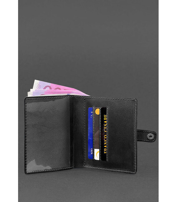 Всередині є 1 відділення для купюр, 3 слоти для пластикових карт, прозора кишеня та відділення для документа. Закривається портмоне-обкладинка хлястиком з кнопкою.