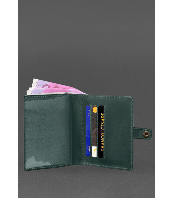 Всередині є 1 відділення для купюр, 3 слоти для пластикових карт, прозора кишеня та відділення для документа. Закривається портмоне-обкладинка хлястиком з кнопкою.