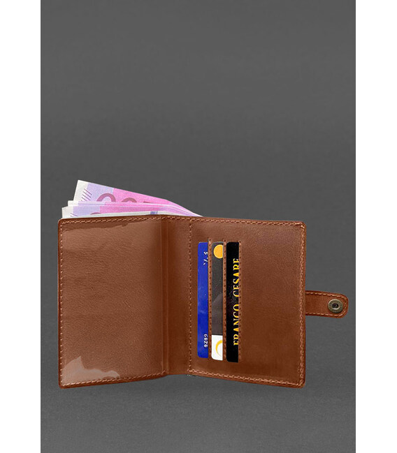 Всередині є 1 відділення для купюр, 3 слоти для пластикових карт, прозора кишеня та відділення для документа. Закривається портмоне-обкладинка хлястиком з кнопкою.