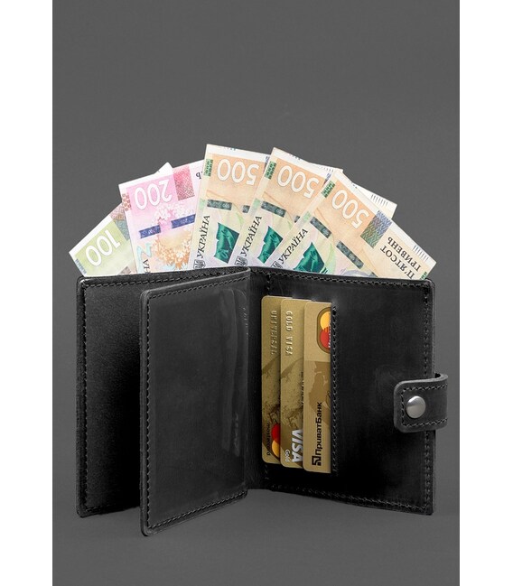 Всередині є 1 відділення для купюр, 3 слоти для пластикових карт, прозора кишеня та відділення для документа. Закривається портмоне-обкладинка хлястиком з кнопкою.