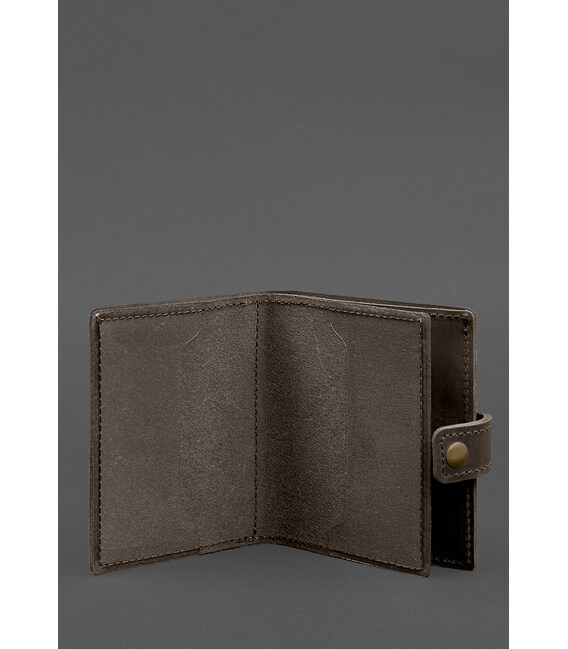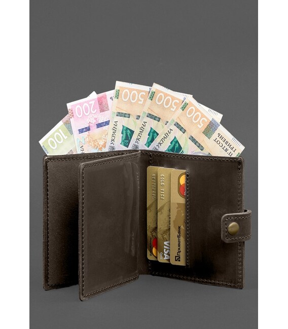 Всередині є 1 відділення для купюр, 3 слоти для пластикових карт, прозора кишеня та відділення для документа. Закривається портмоне-обкладинка хлястиком з кнопкою.